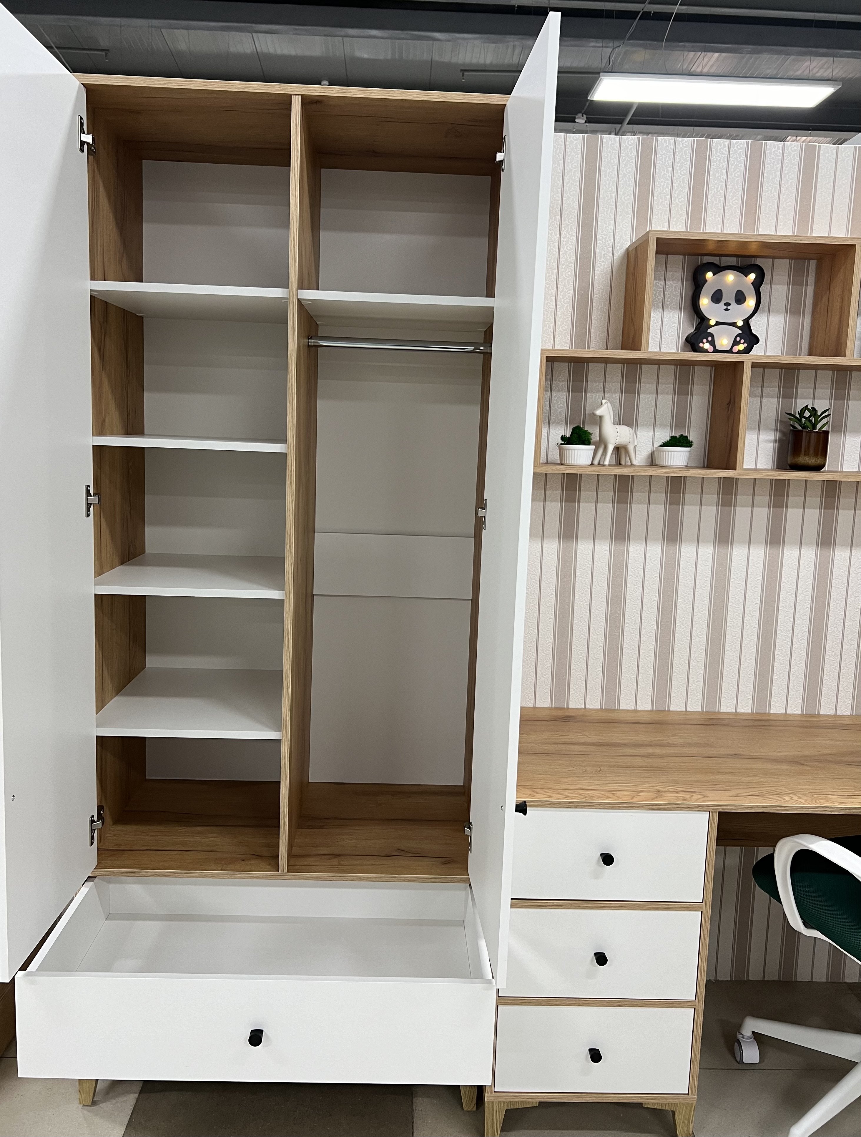 Шкаф выполнен из сертифицированного, качественного, экологически чистого ЛДСП класса Е0,5 в сочетании цветов дуб золотистый с белым.