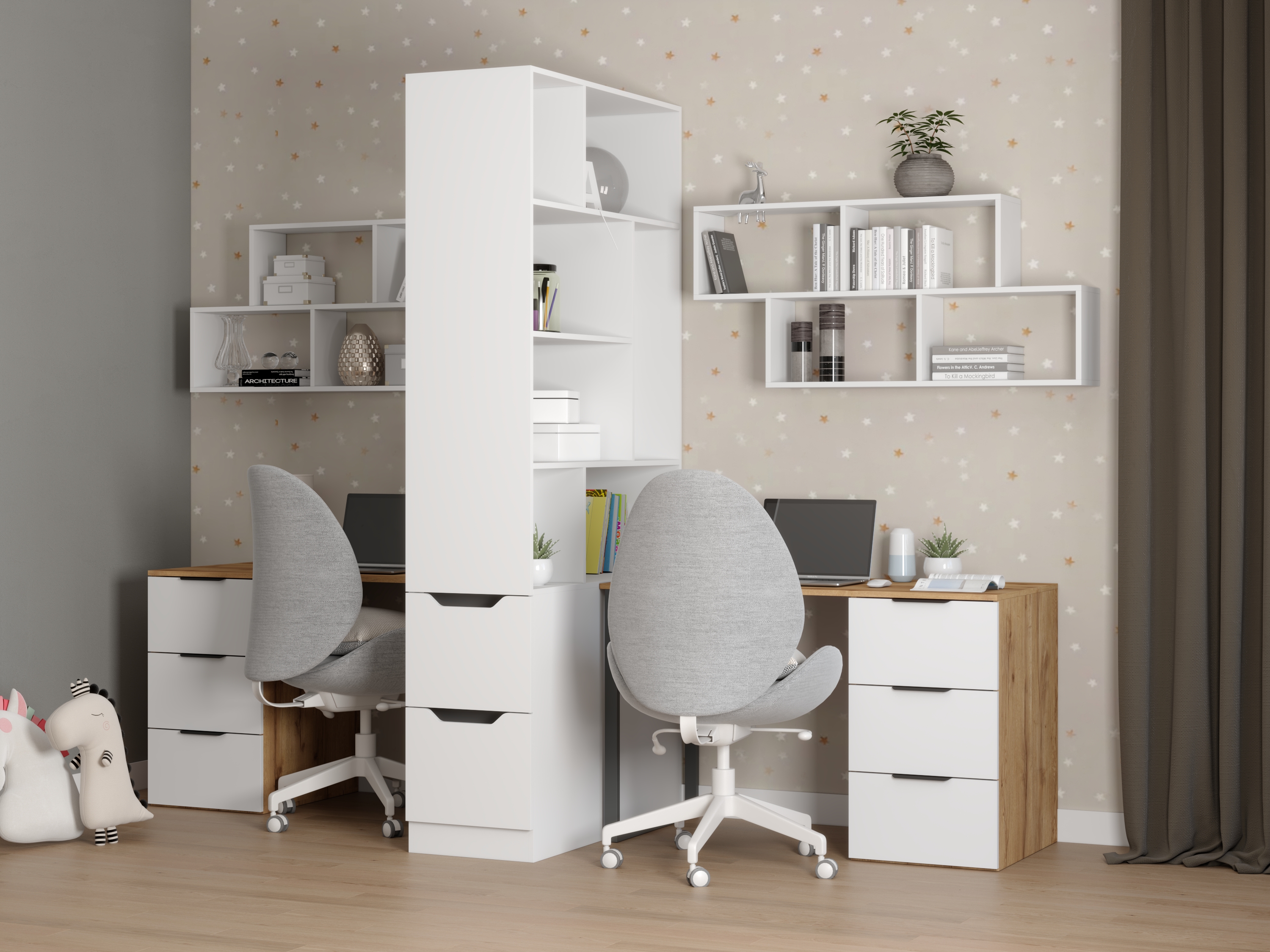 В стоимость комплекта входят: стол (2 шт) + стеллаж-перегородка + полка настенная (2 шт)
