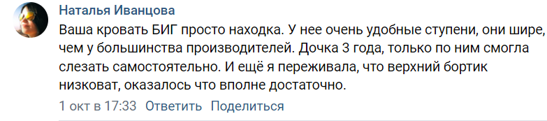 <virtues>Дети счастливы! Шикарная кровать! Теперь всем удобно. Радует качество - крепкая, не шатается. Дети теперь не слазят с нее))</virtues>