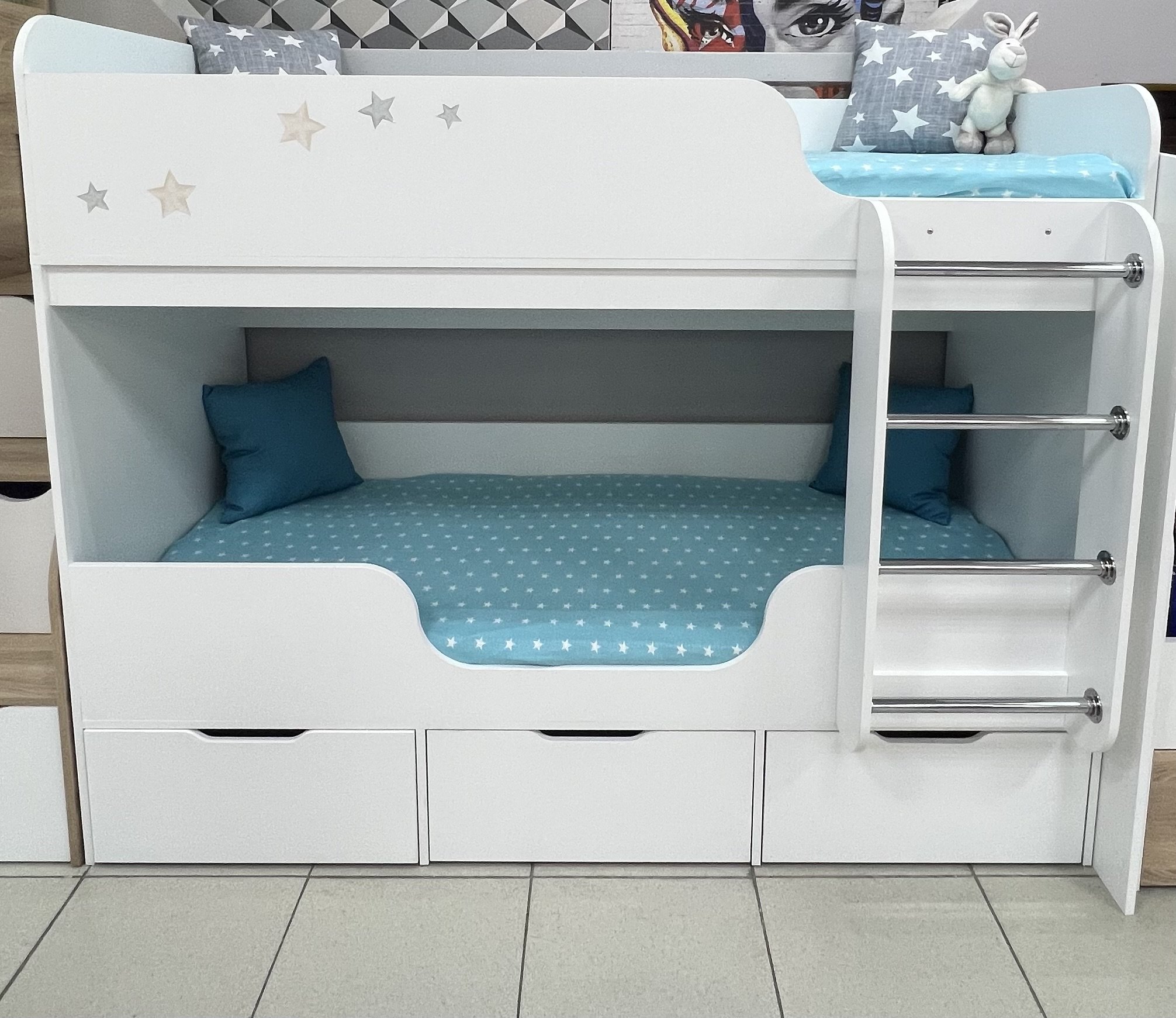 Кровать имеет три вместительных выдвижных ящика.