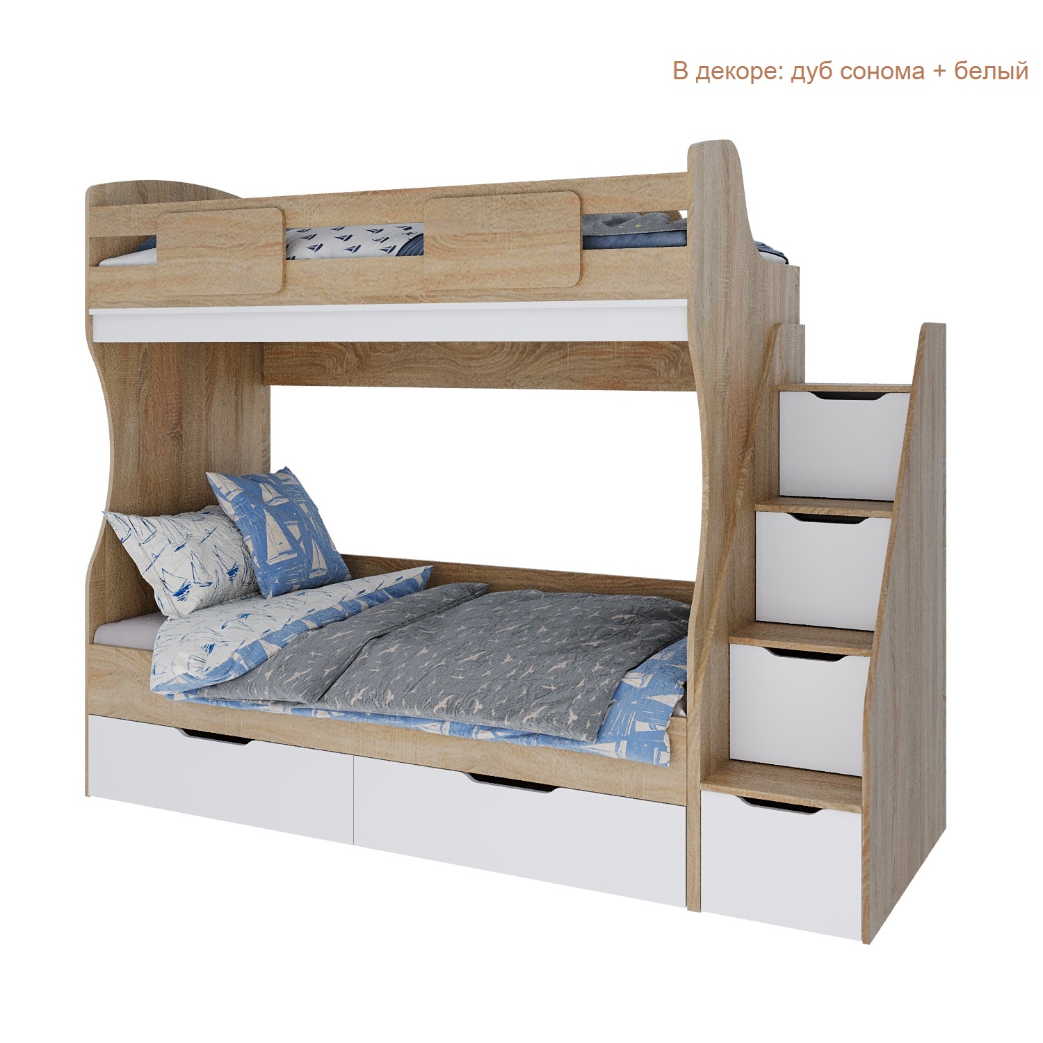 Кровать имеет также два выдвижных ящика для хранения белья или игрушек с доводчиками.