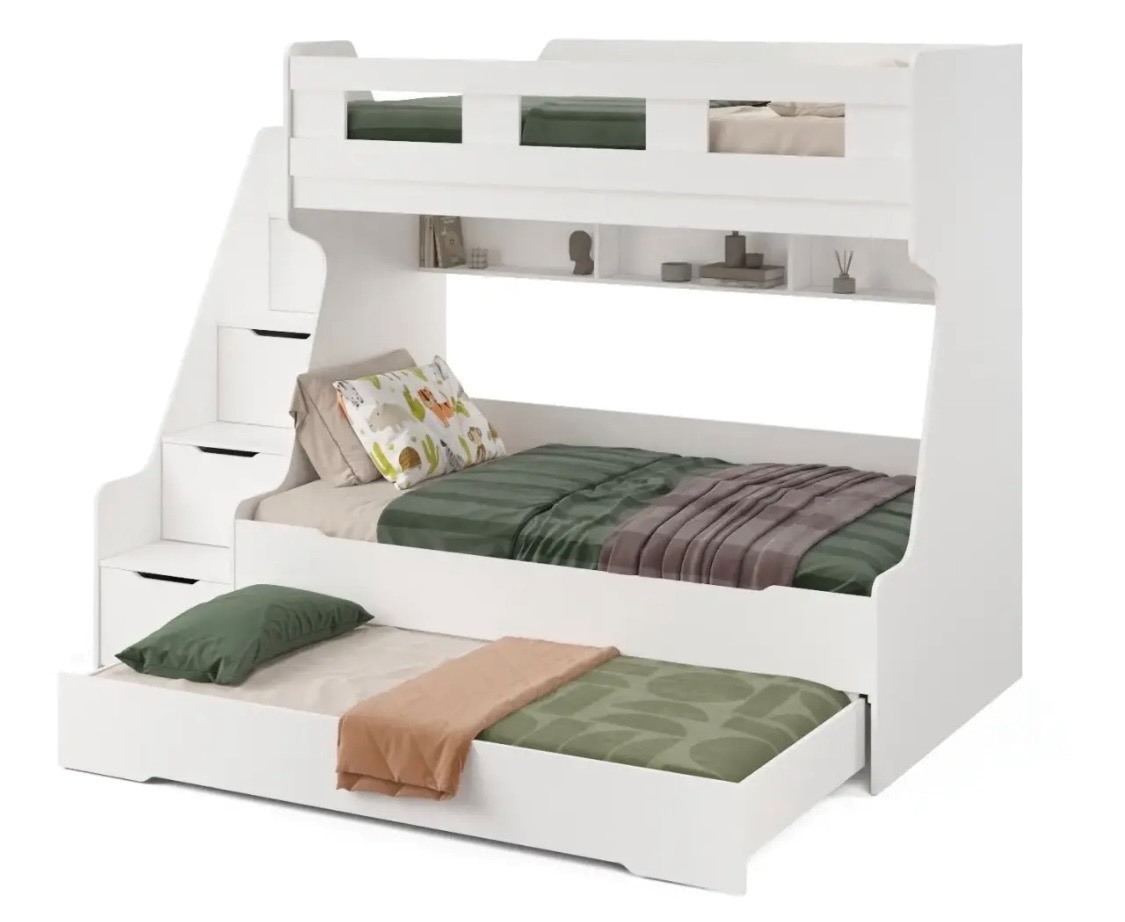 Высокая нагрузка на спальные места. Дополнительное выдвижное спальное место. Удобная лестница. Высокий, безопасный бортик |
