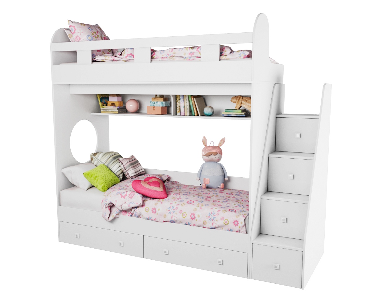 спальное место для двоих, навесная полка для книг и игрушек, вместительные выдвижные ящики под кроватью, а также безопасная лестница, обеспечивающая быстрый и удобный доступ на второй этаж.