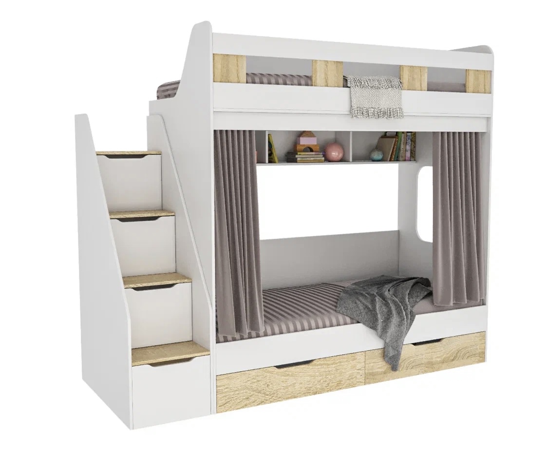 спальное место для двоих, навесная полка для книг и игрушек, вместительные выдвижные ящики под кроватью, а также безопасная лестница расположенная сбоку, обеспечивающая быстрый и удобный доступ на второй этаж, с безопасными ступенями в виде выдвижных ящиков.