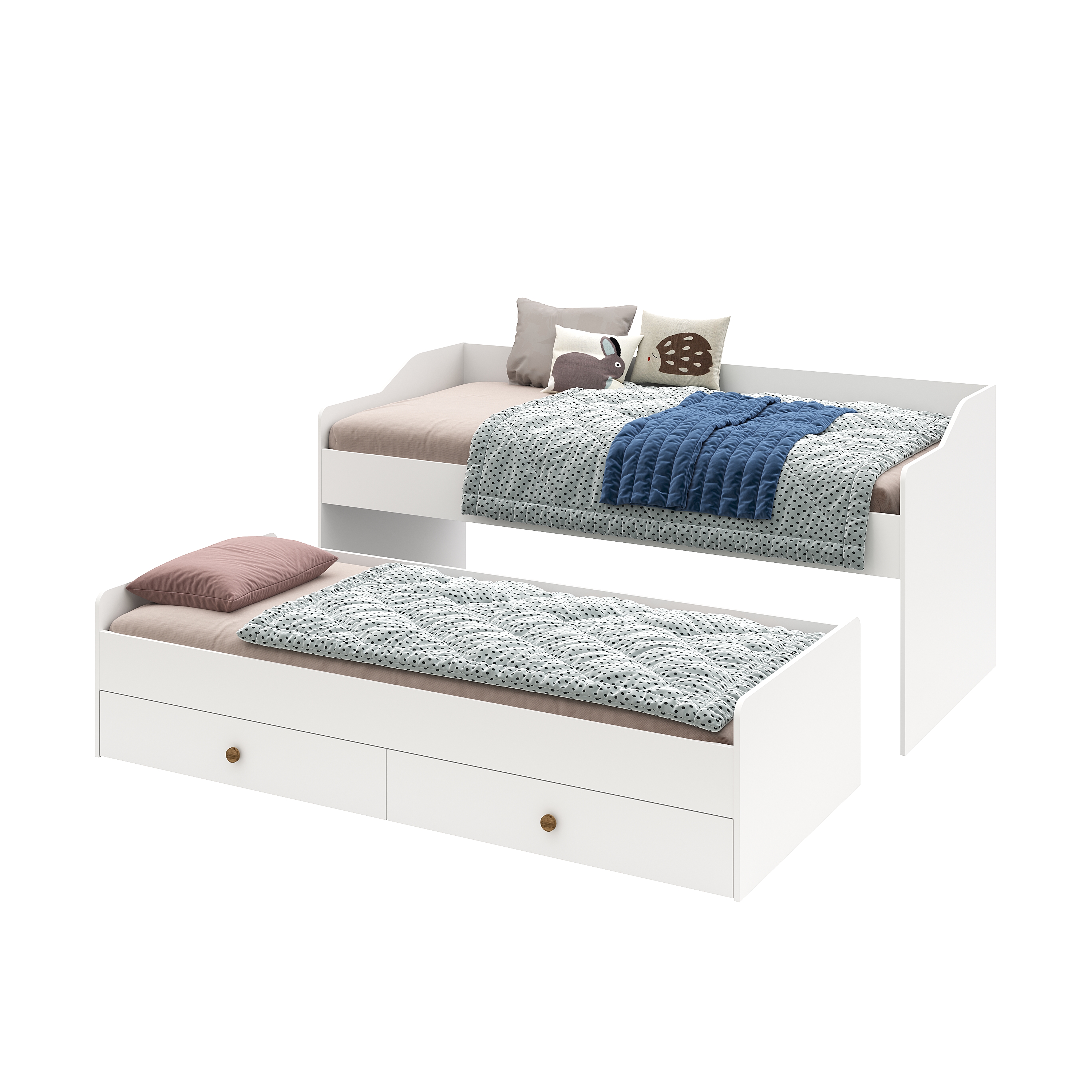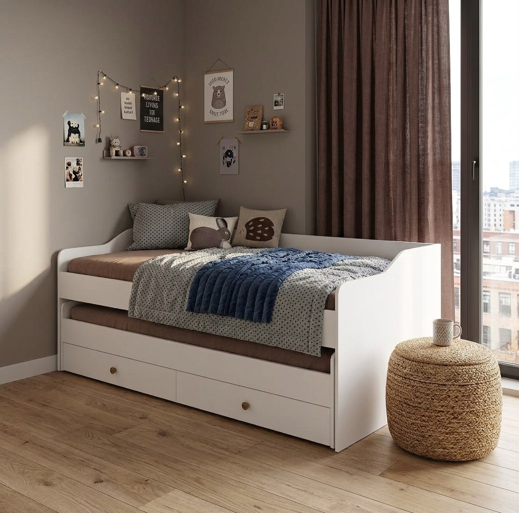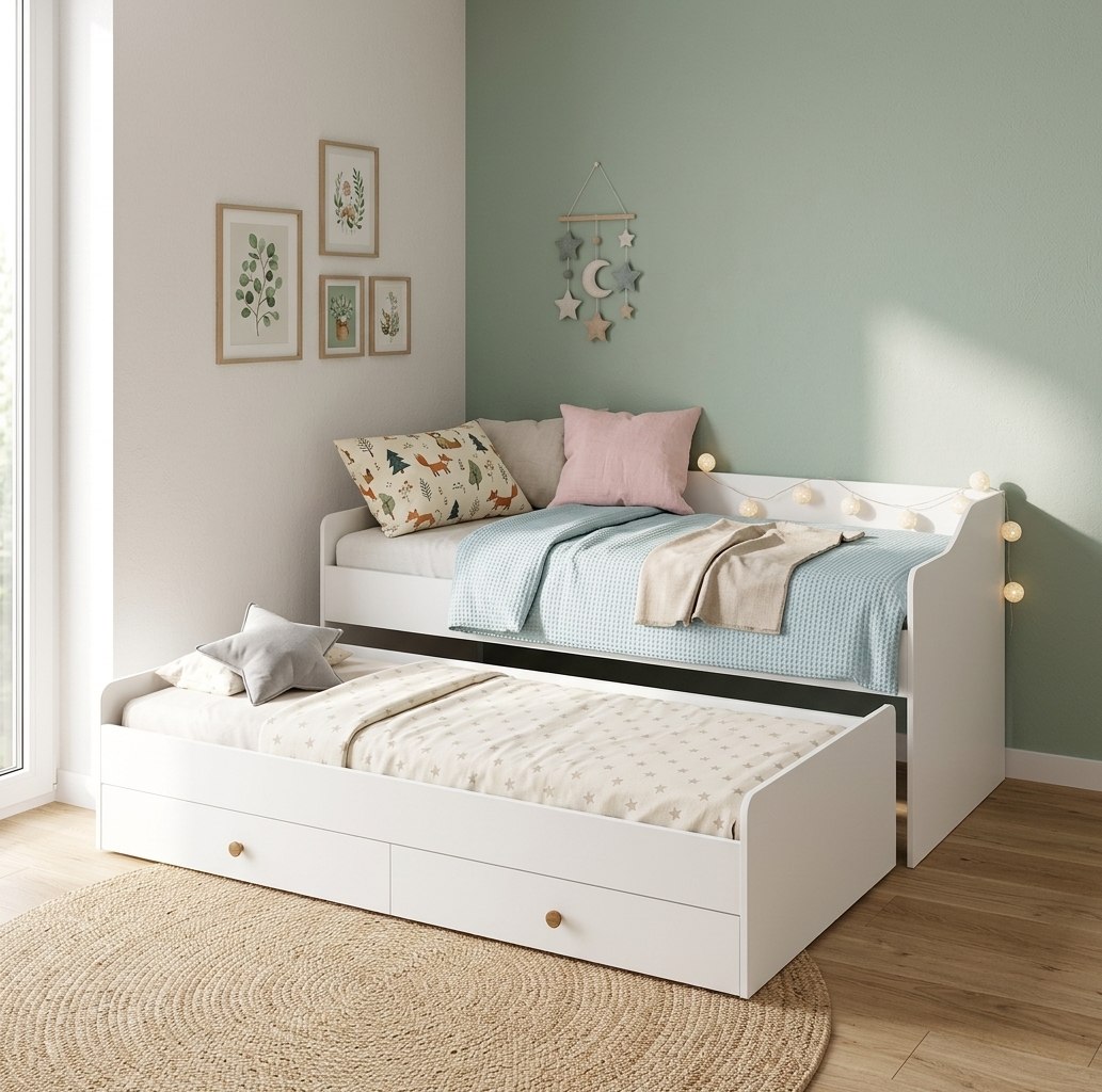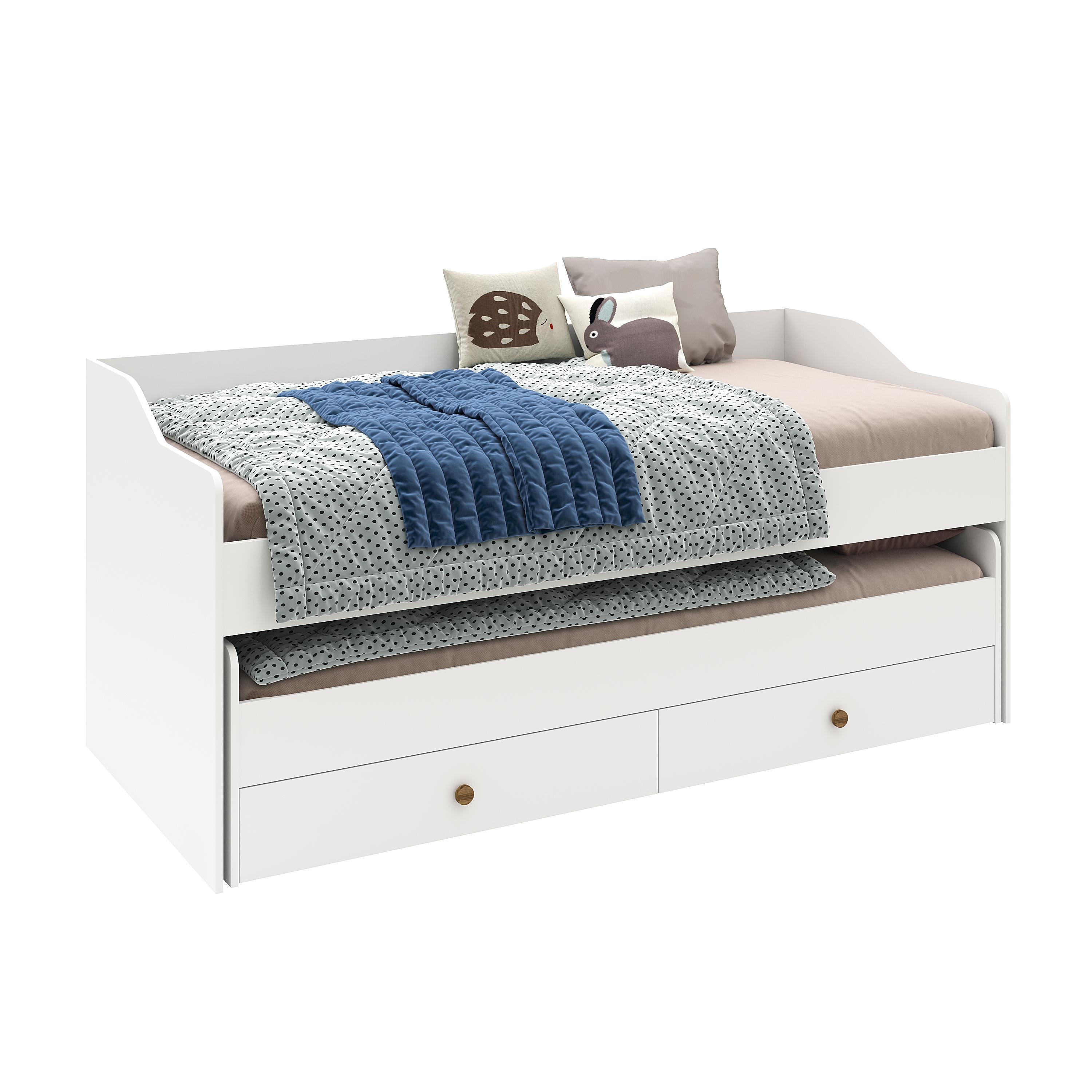 Выдвижное спальное место позволяет гибко использовать пространство, а два встроенных ящика в нижней кровати на шариковых направляющих обеспечат место для хранения.