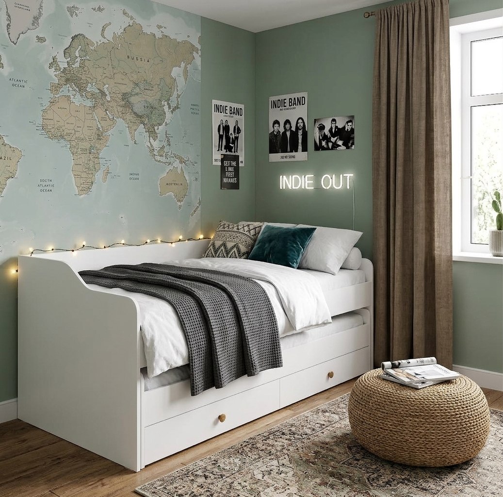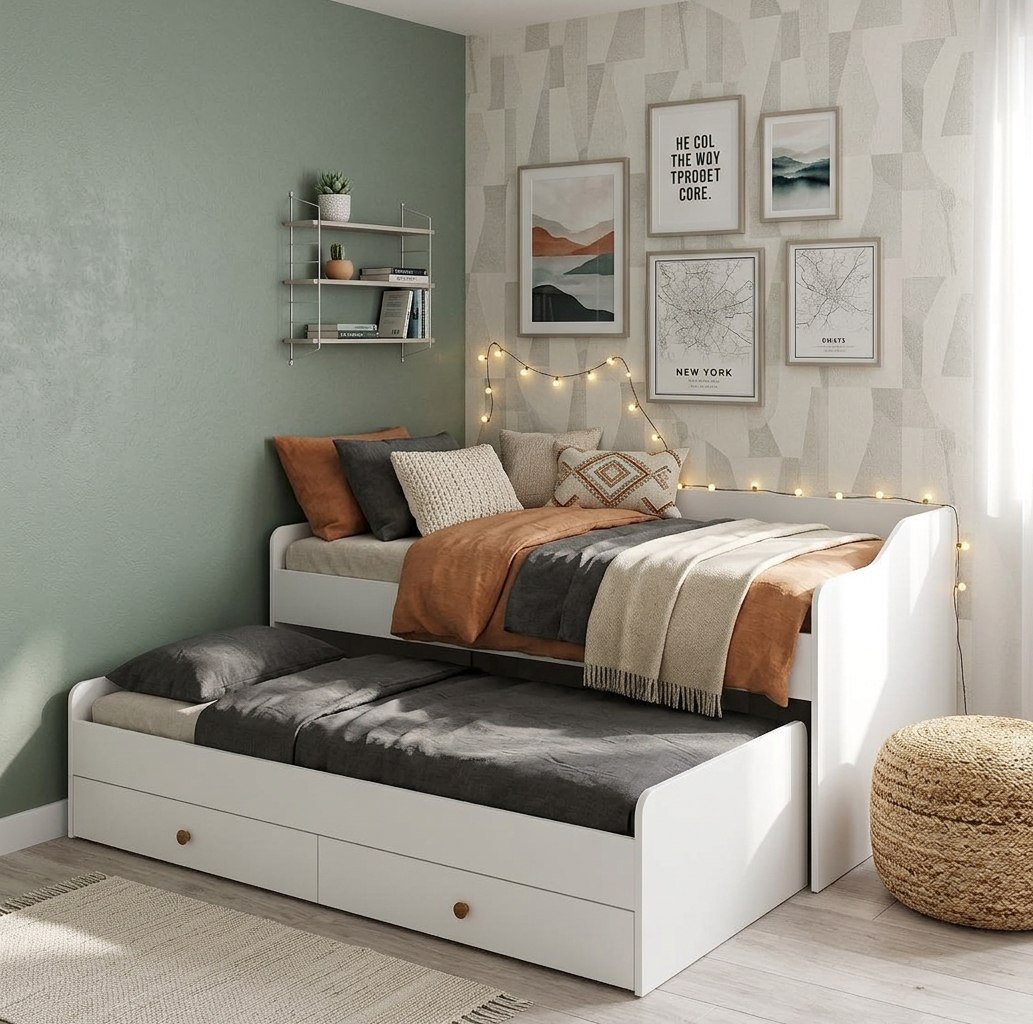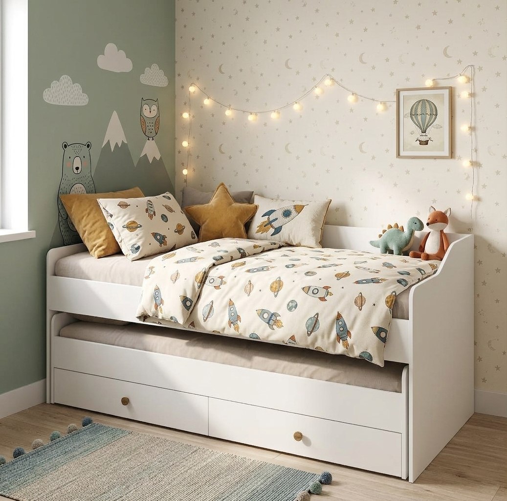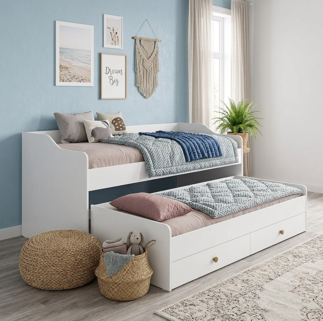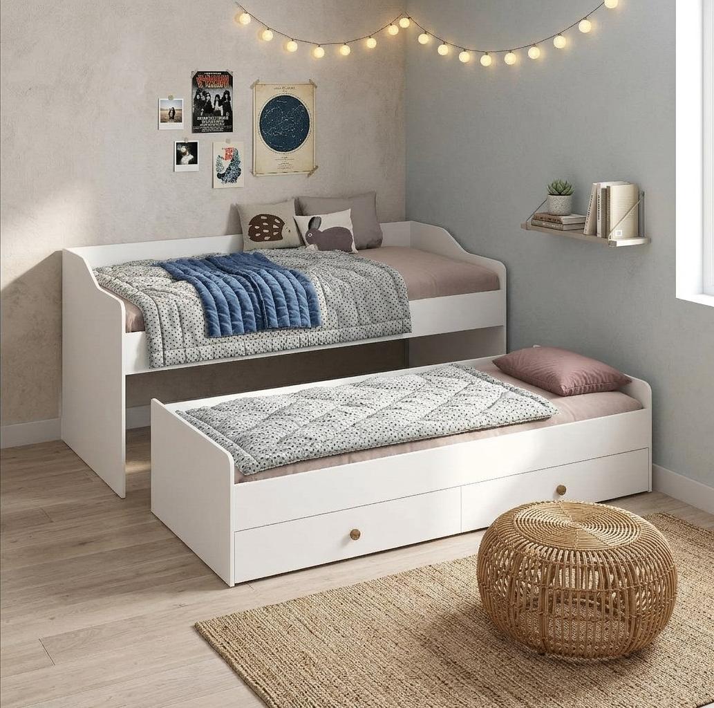 Выдвижное спальное место позволяет гибко использовать пространство, а два встроенных ящика в нижней кровати на шариковых направляющих обеспечат место для хранения.