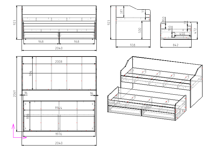 ширина 2040, высота 923, глубина 938 мм