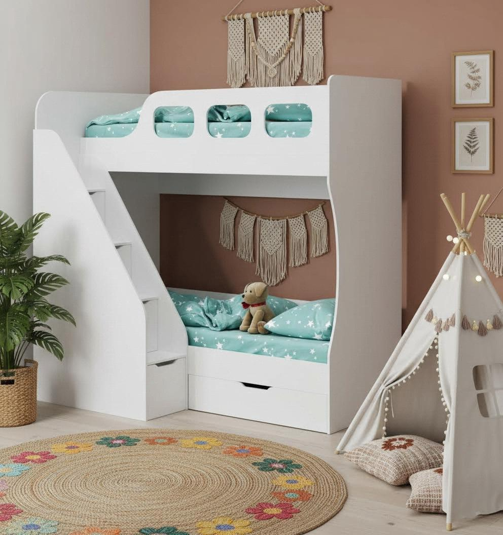 * В нижнюю кровать встроен выдвижной ящик для белья и игрушек.