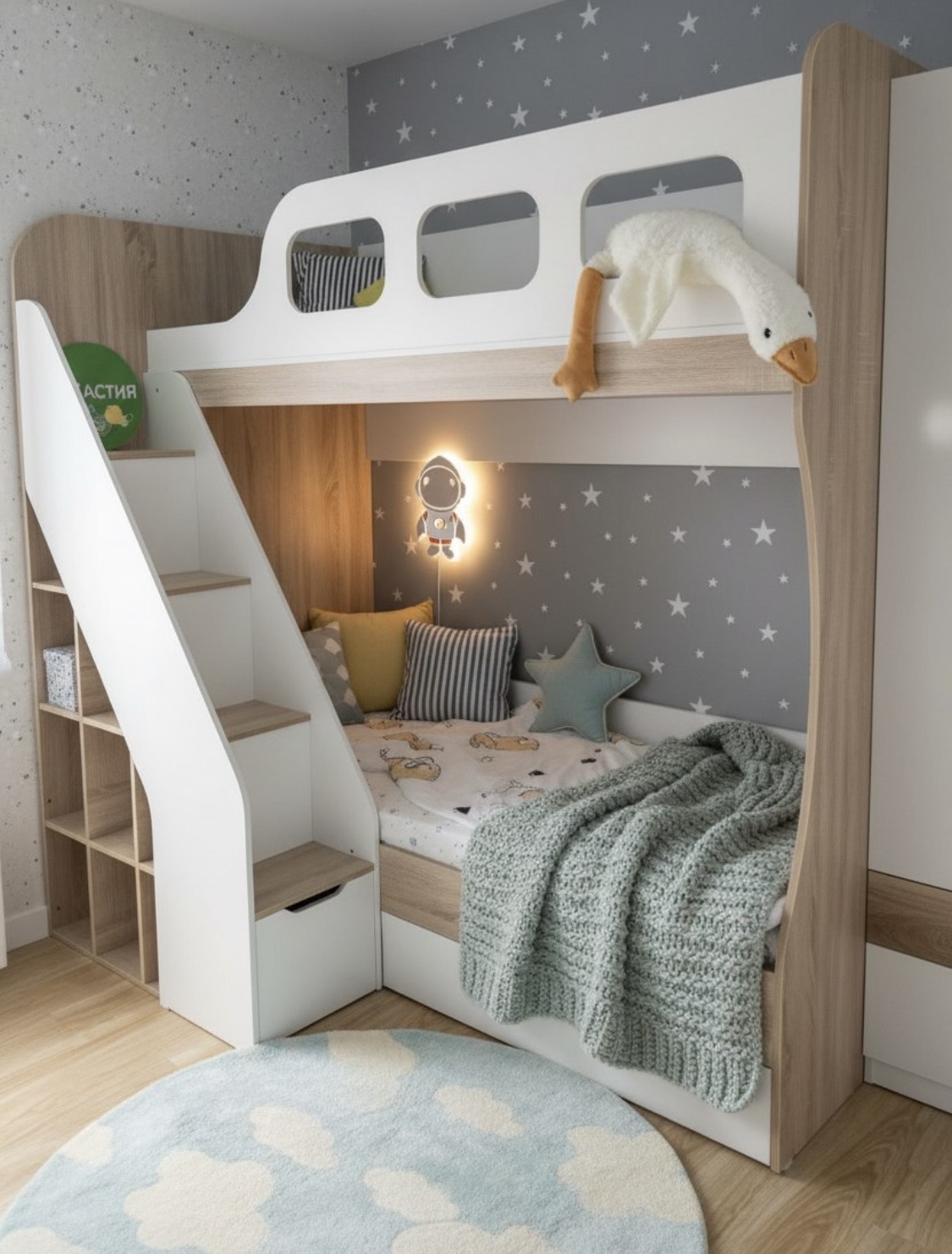 Удобная, безопасная лестница со встроенными полочками для книг и игрушек и комфортная высота кровати.