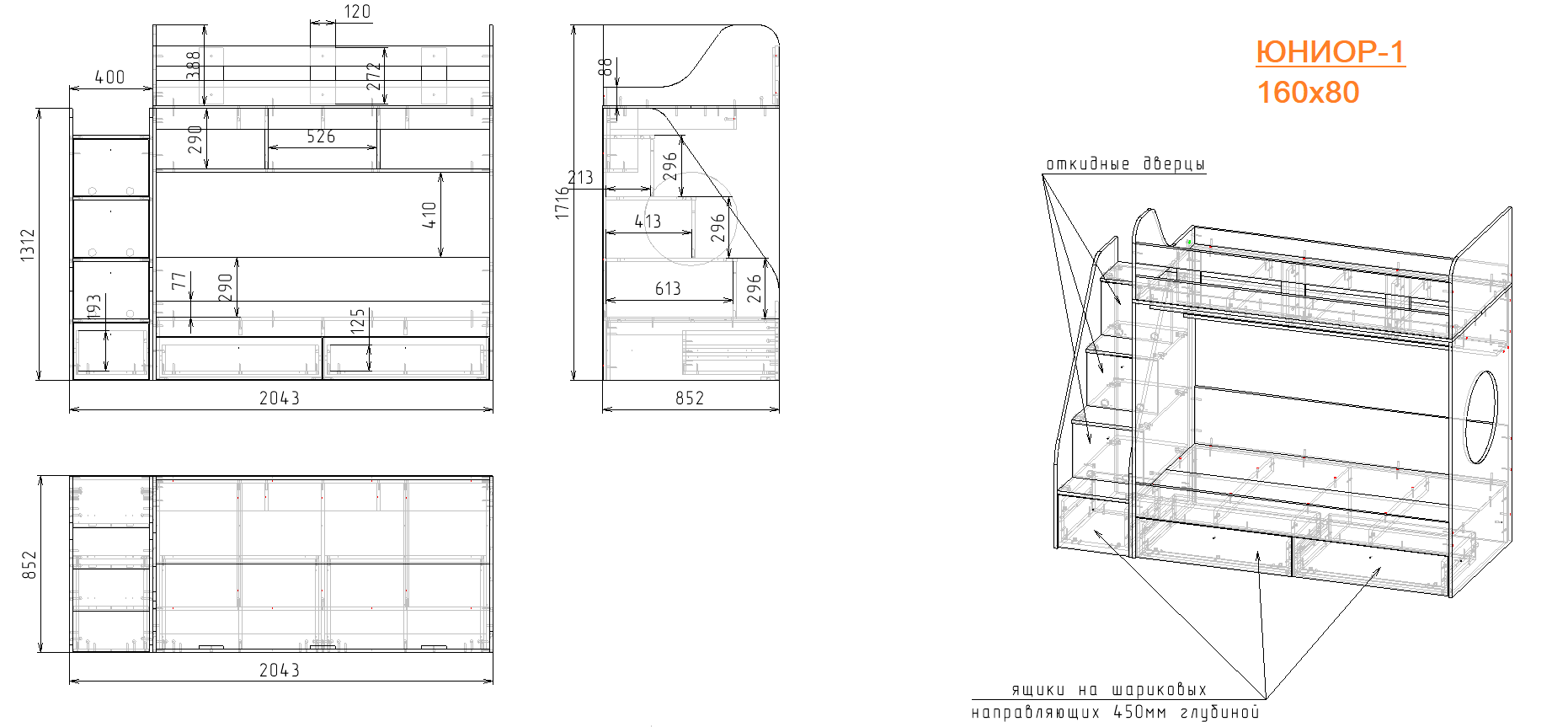 Высокая нагрузка на спальные места. Дно всех выдвижных ящиков прочное - выполнено из ЛДСП 16 мм (не ДВП!) |