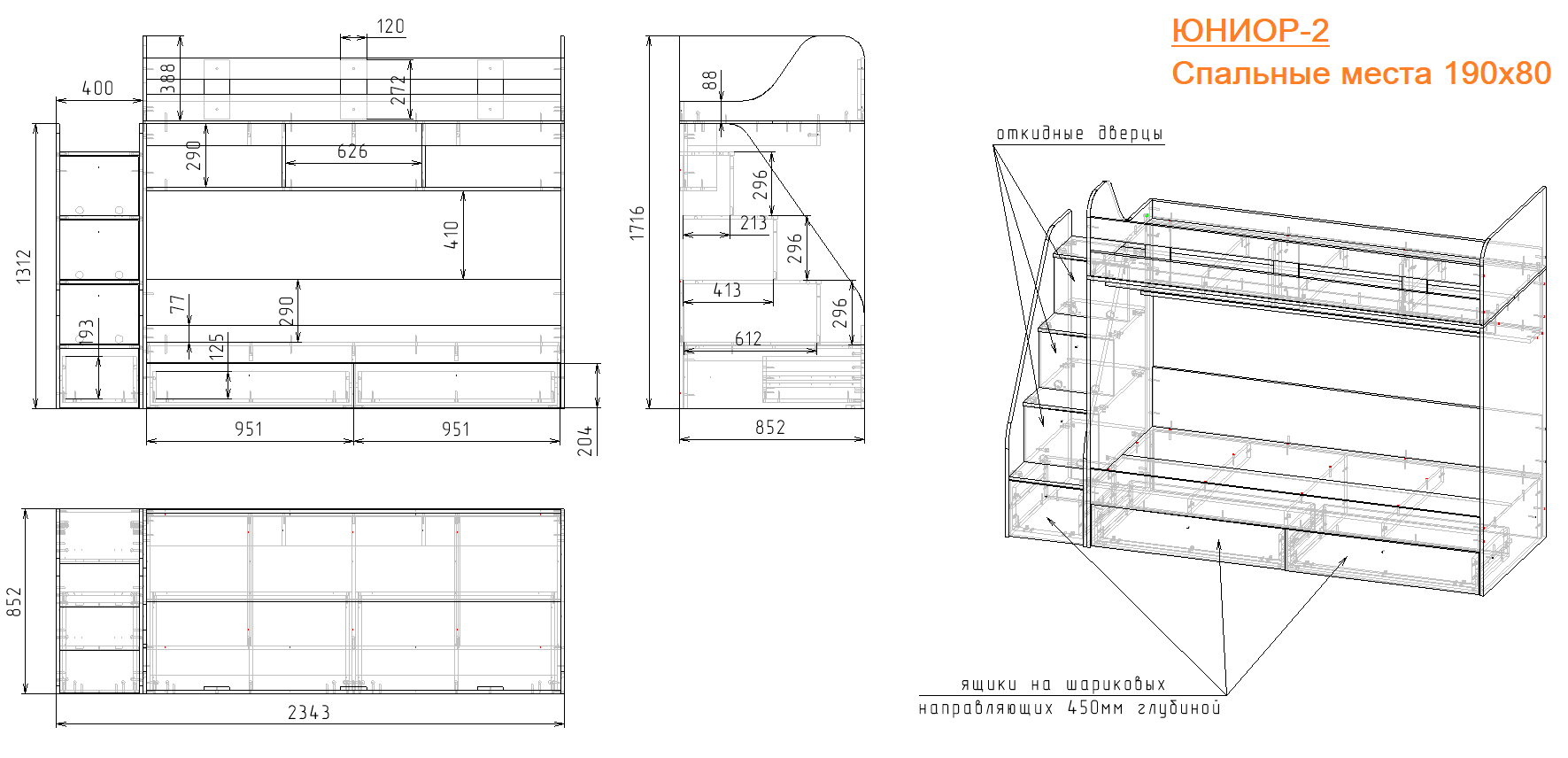 Высокая нагрузка на спальные места. Прочные ящики! Высокий безопасный борт |