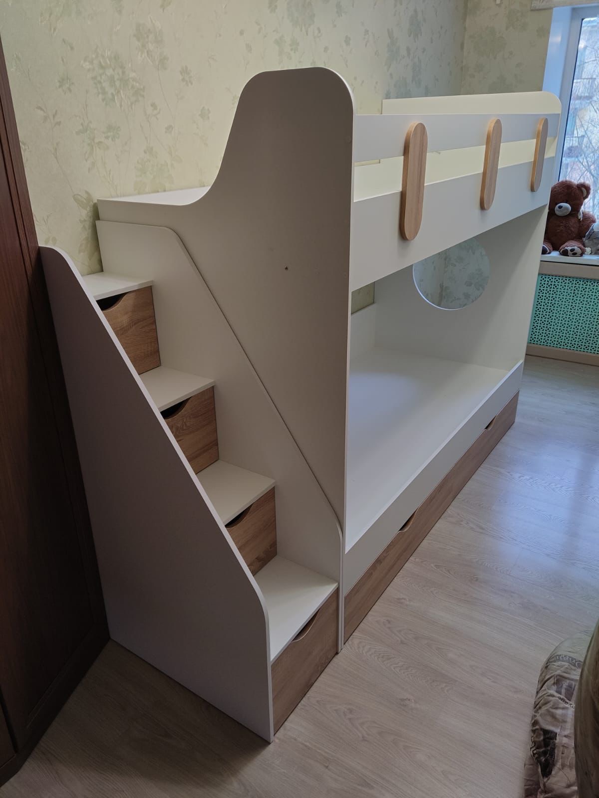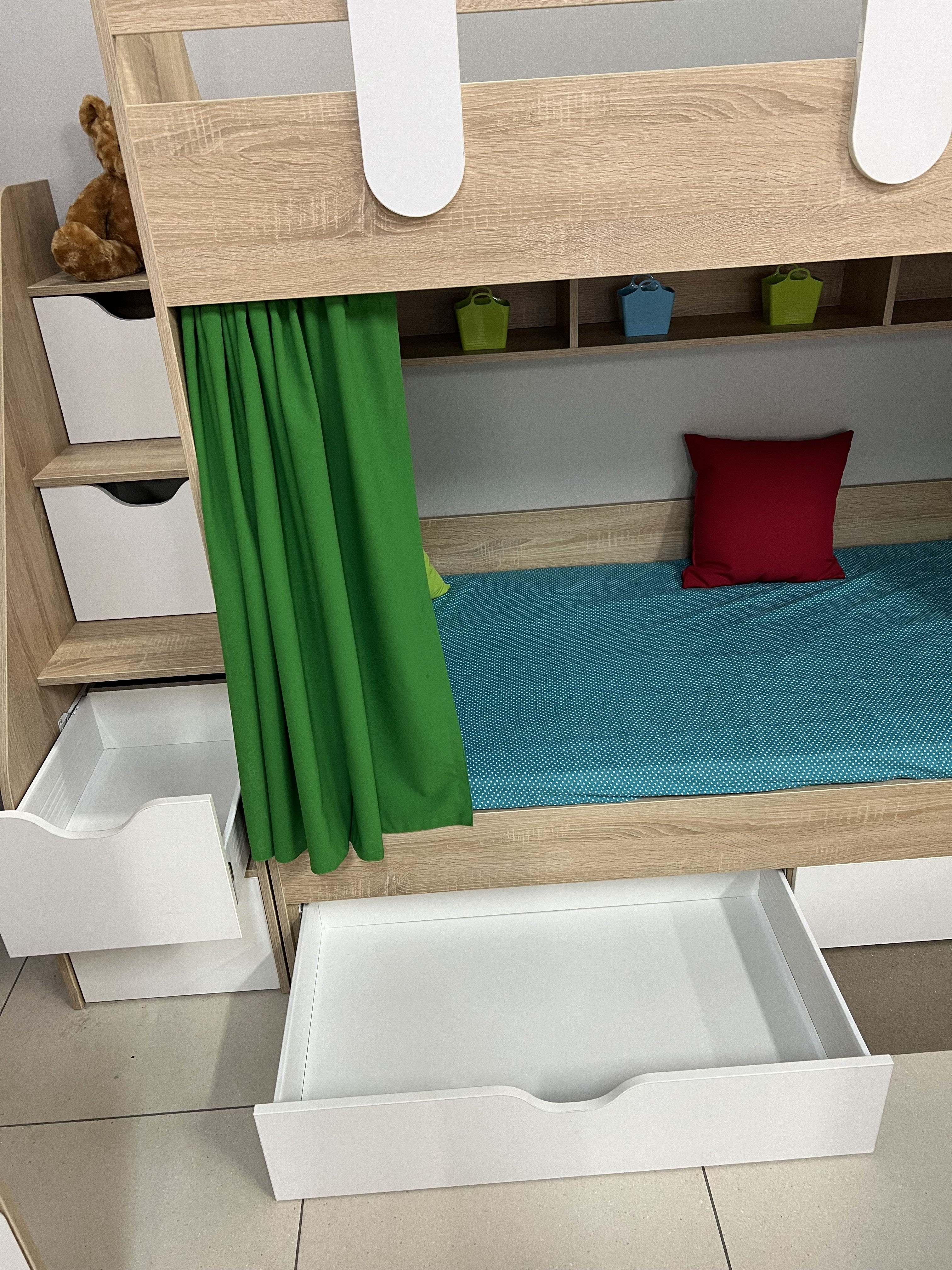 В лестницу встроены выдвижные ящики для игрушек.