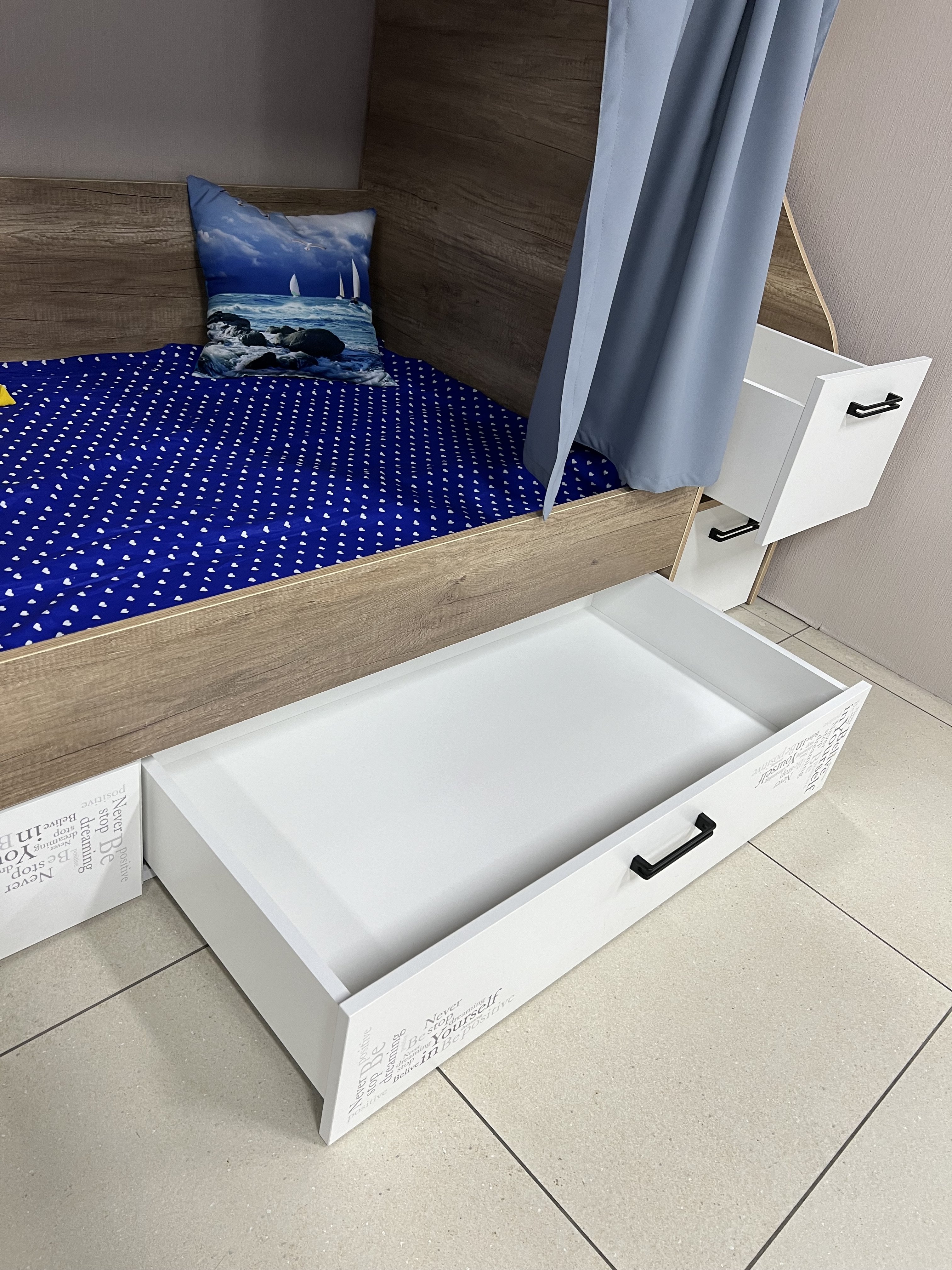 Вместо них - цельный и прочный настил из ЛДСП, который выдерживает сверхвысокую нагрузку и позволяет расположиться даже взрослому с ребенком.