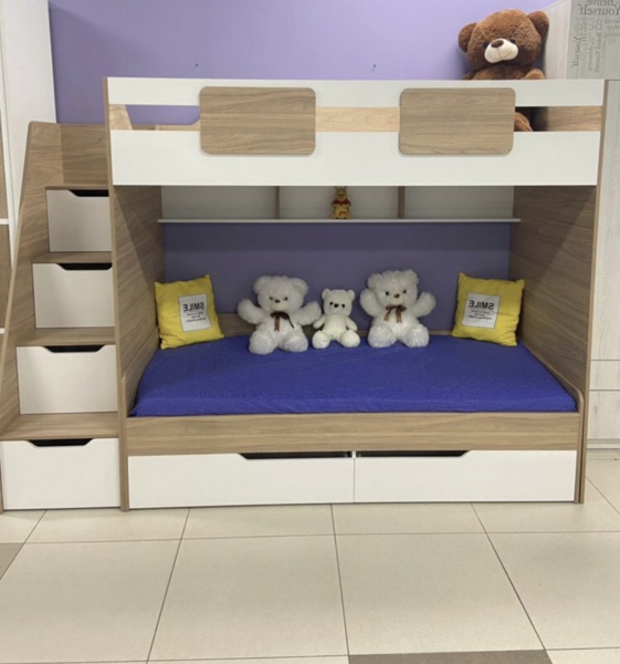 Данная модель позволит создать уютную детскую спальню для двоих детей, не перегрузив ее при этом мебелью.