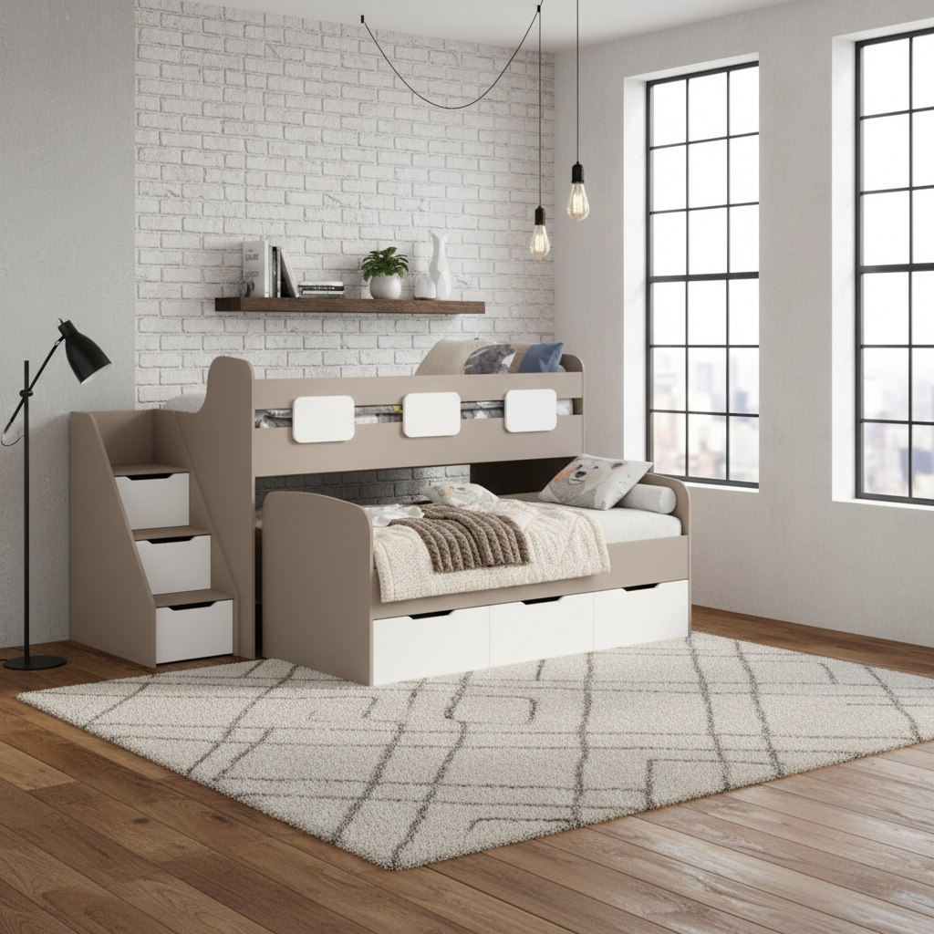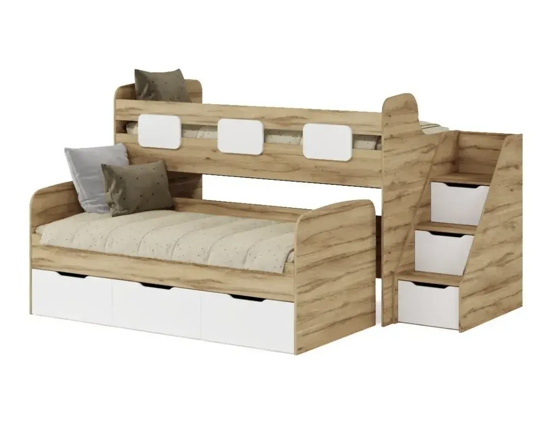 - Невысокая конструкция кровати обеспечивает удобный доступ на второй этаж, делая её идеальной даже для самых маленьких детей.