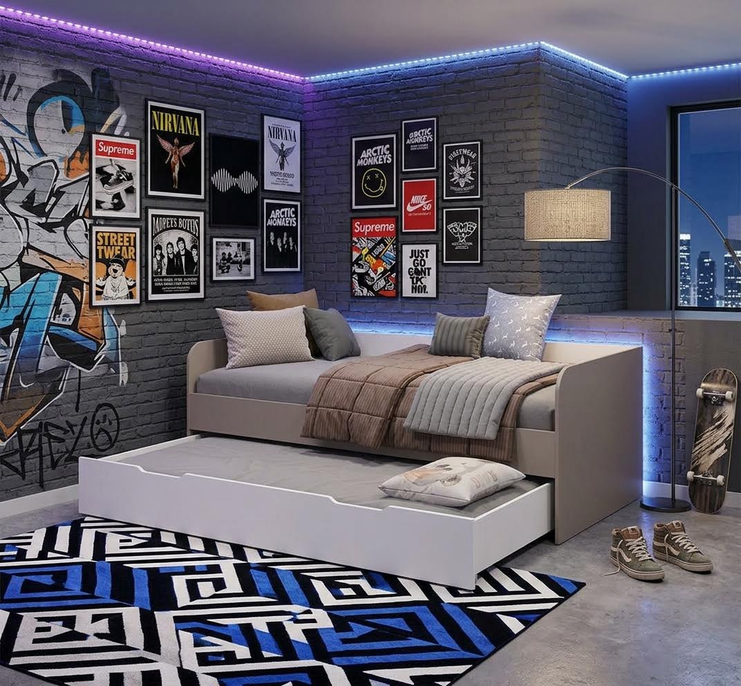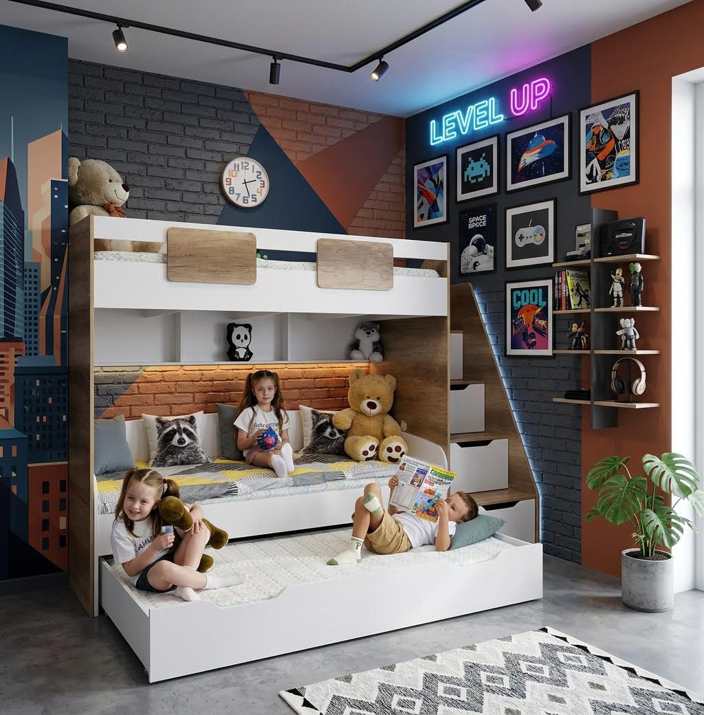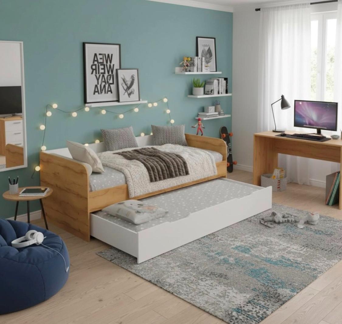 Экономия пространства: выдвижное спальное место легко убирается под основную кровать, освобождая место для игр и активного отдыха.