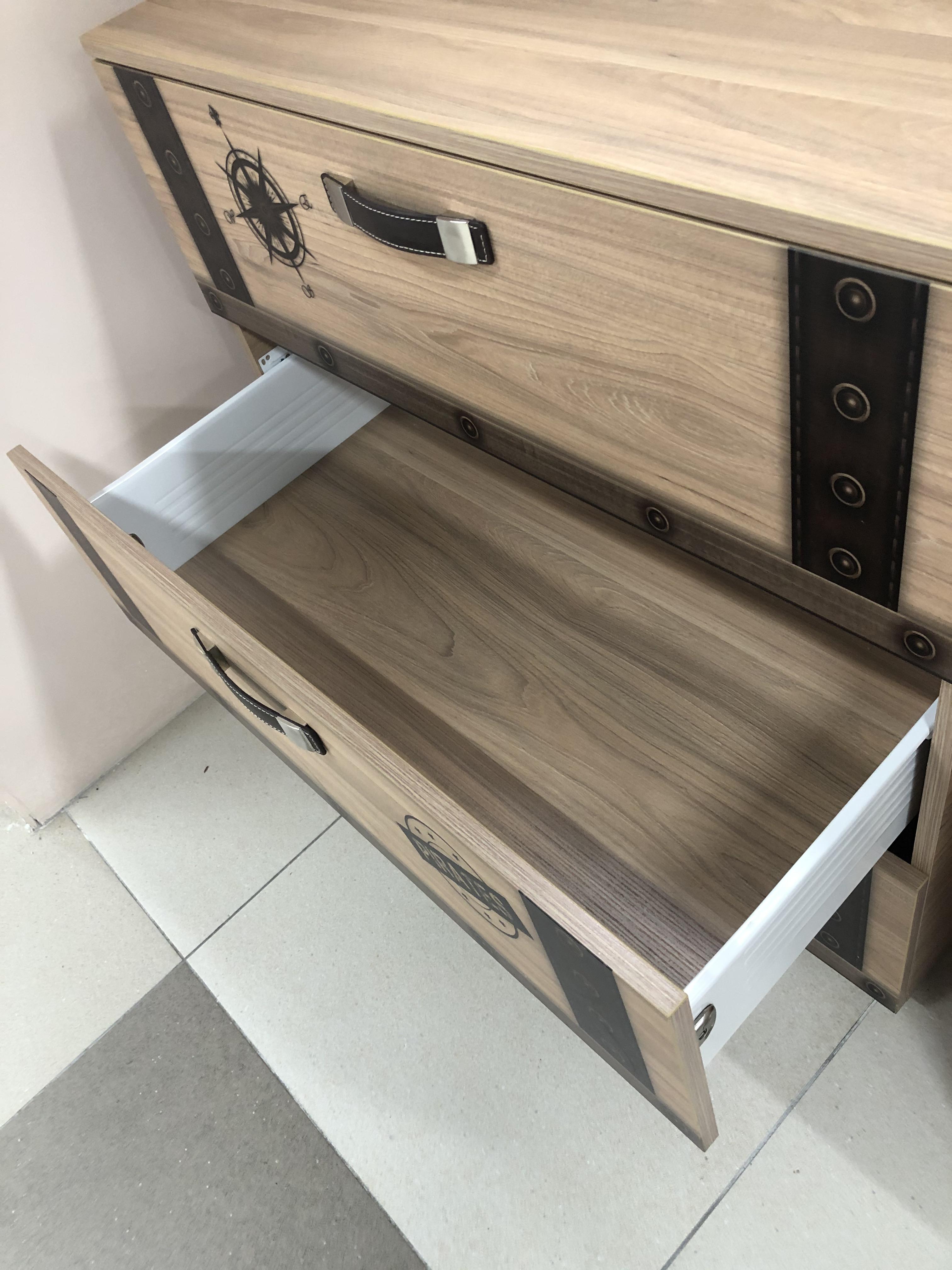 Ящики комода сделаны с применением метабоксов и оснащены бесшумными направляющими полного выдвижения, жесткое дно из ЛДСП толщиной 16 мм не прогнется и не сломается.