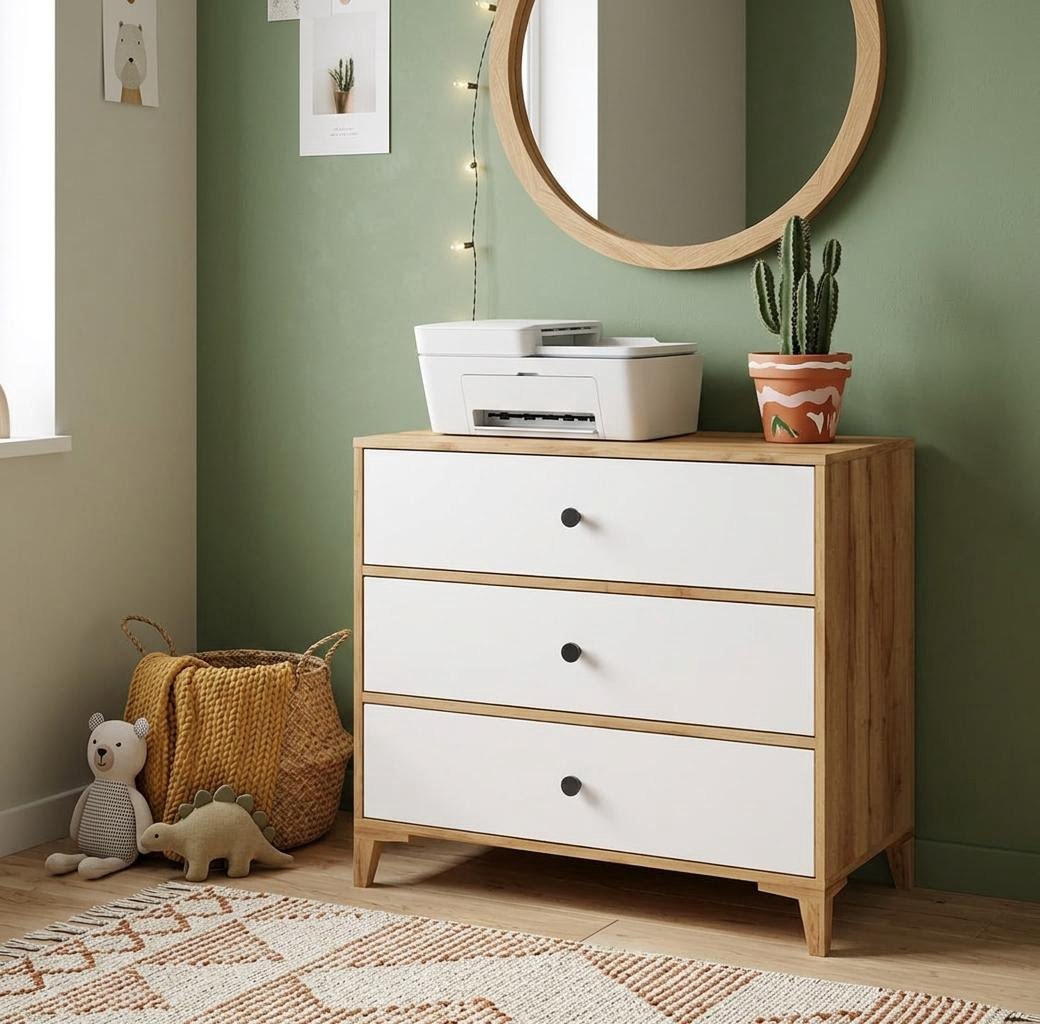 В комод встроены три выдвижных ящика на направляющих скрытого монтажа с доводчиками.
