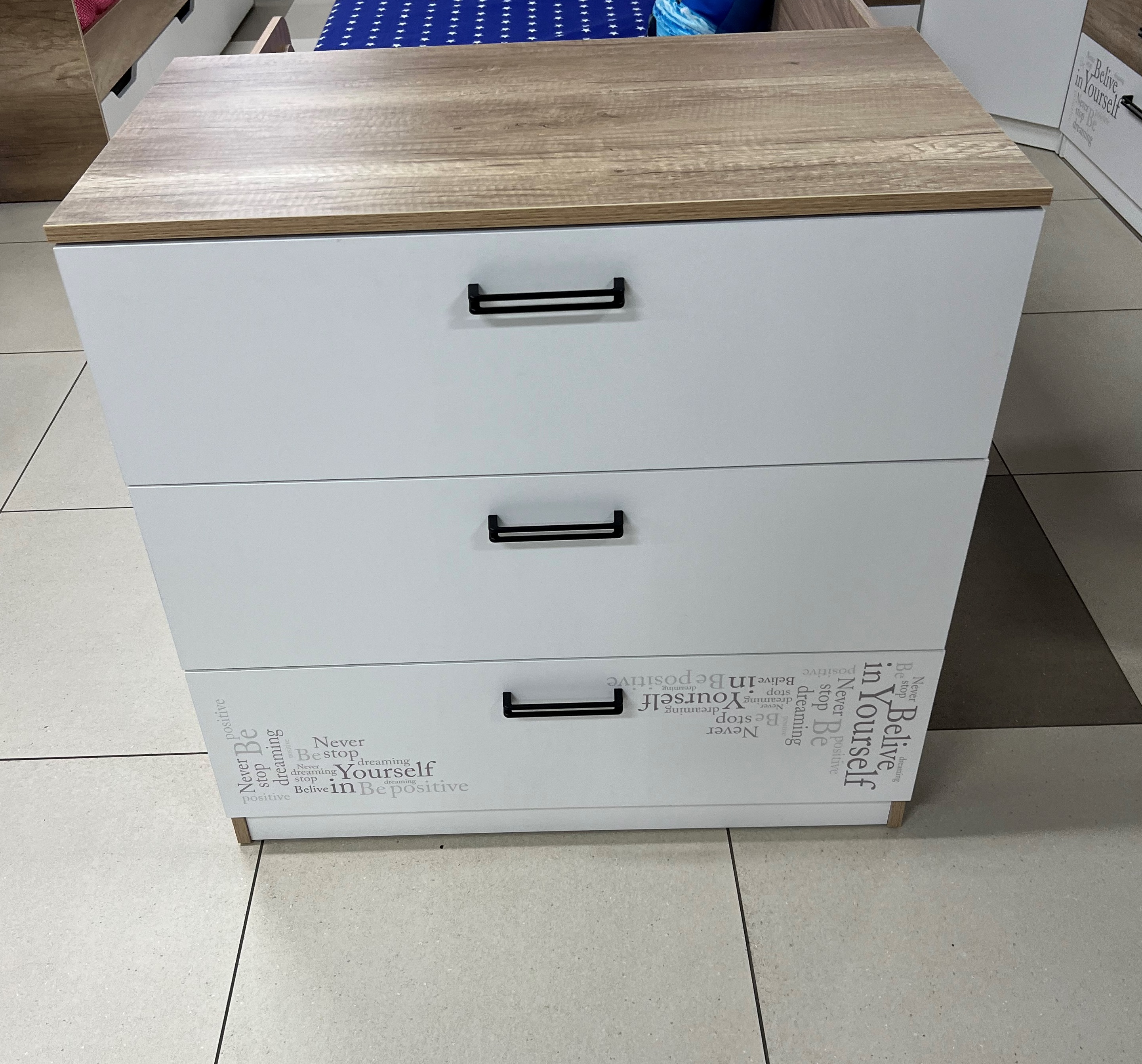 Мебель выполнена из качественного, экологически чистого ЛДСП класса Е0,5 в сочетании цветов "дуб каньон + белый" и оформлена дизайнерским принтом.