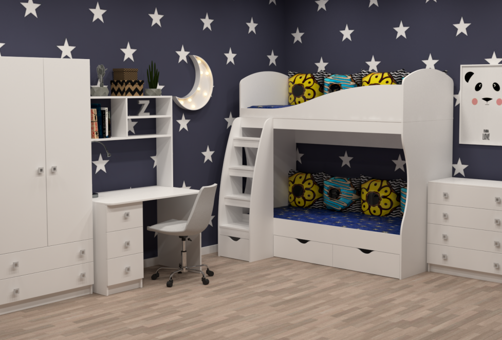 кровать 2-х ярусная + стол + шкаф + комод