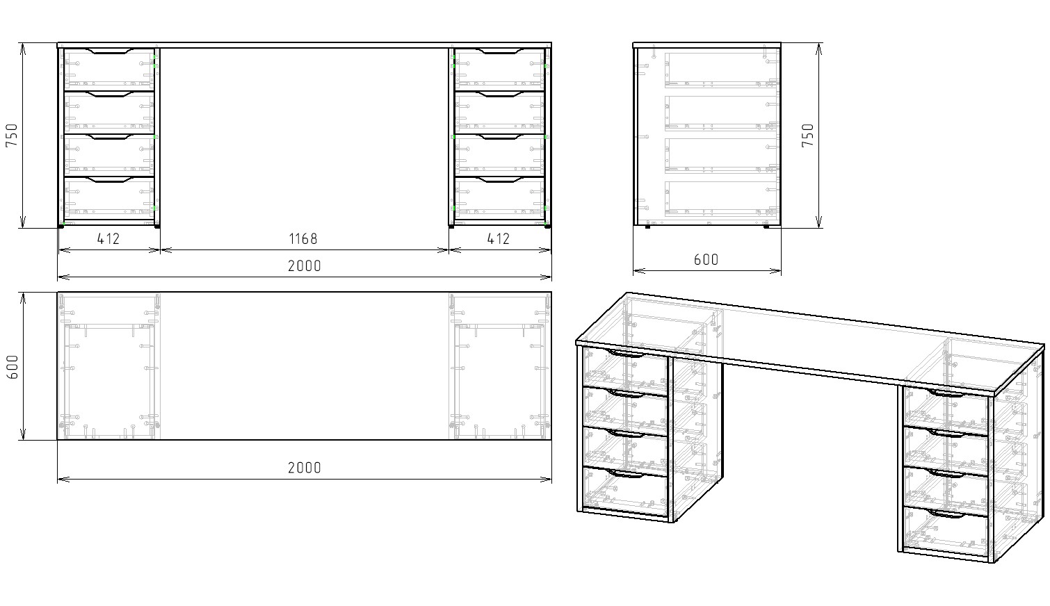 Доводчики, направляющие скрытого монтажа. Столешница и корпус тумб 22 мм. Дно ящиков прочное - выполнено из ЛДСП 16 мм (не ДВП!) |