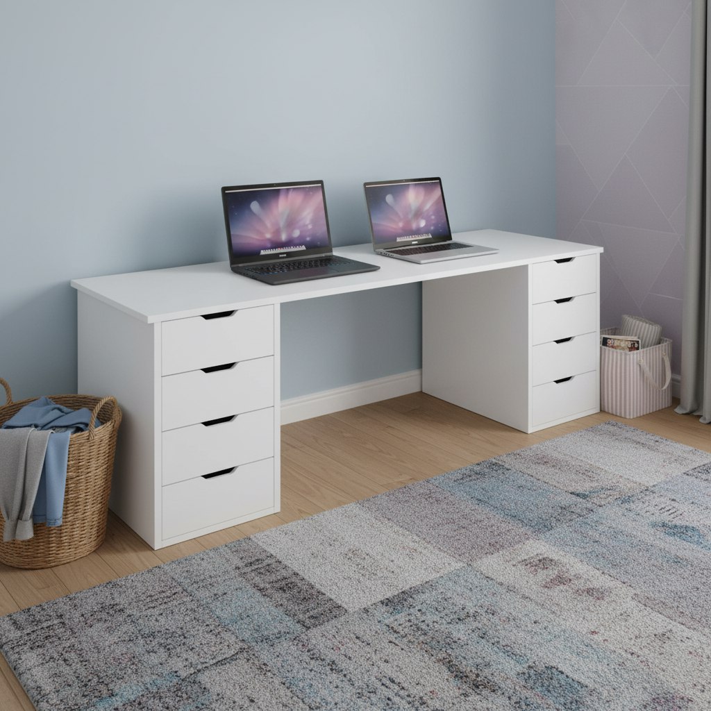 Стол для двоих детей с вместительными тумбами - функциональное решение, которое позволит детям комфортно заниматься учебой.