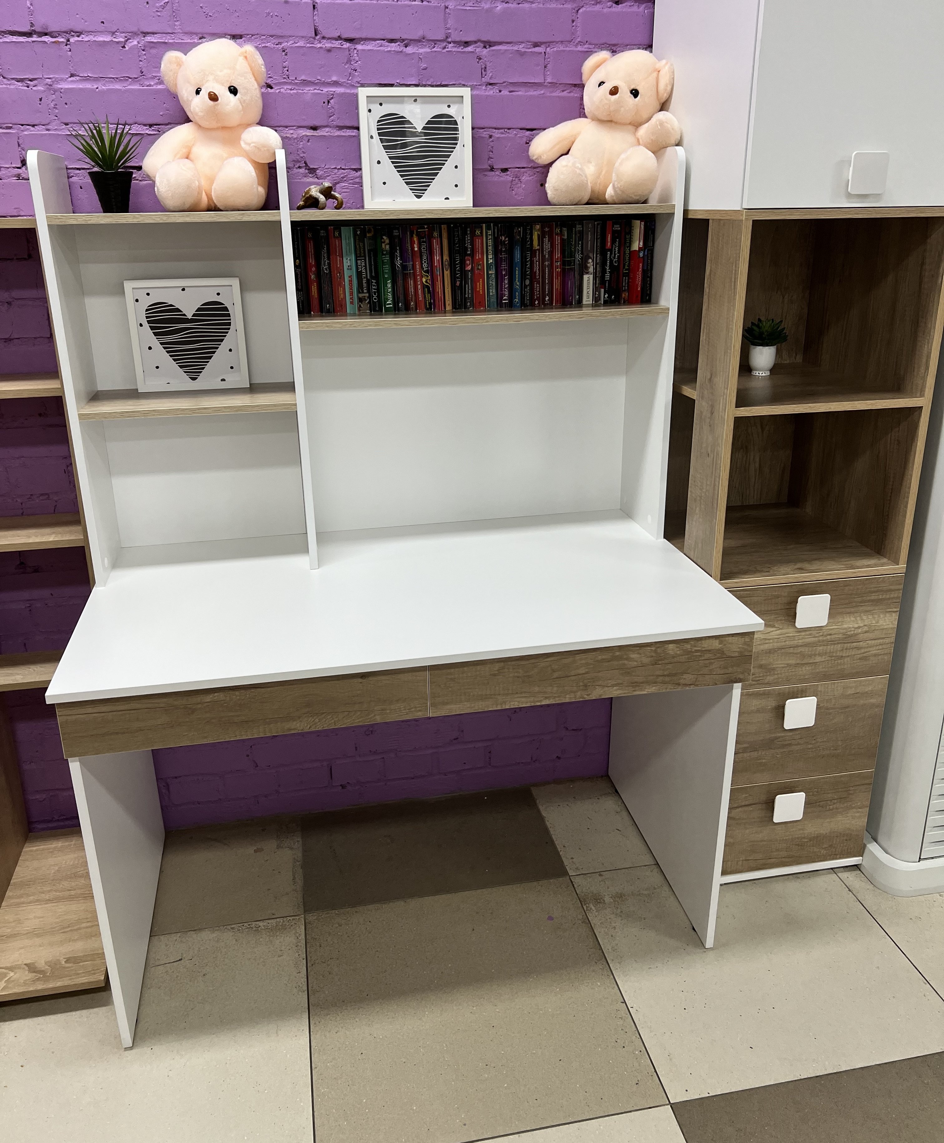Мебель выполнена из сертифицированного, качественного, экологически чистого российского ЛДСП в сочетании цветов "дуб каньон + белый".