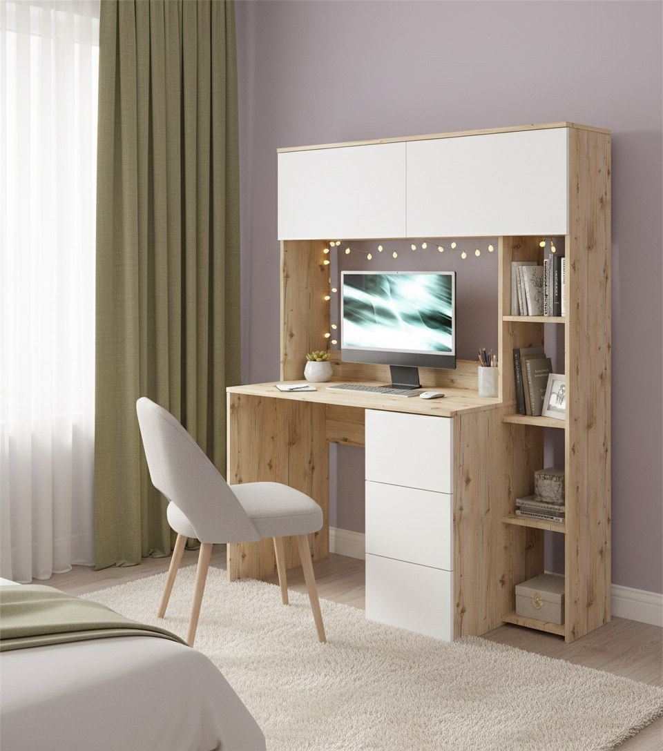 Просторная поверхность, удобные полки и ящики позволят разместить учебники, книги и канцелярию.