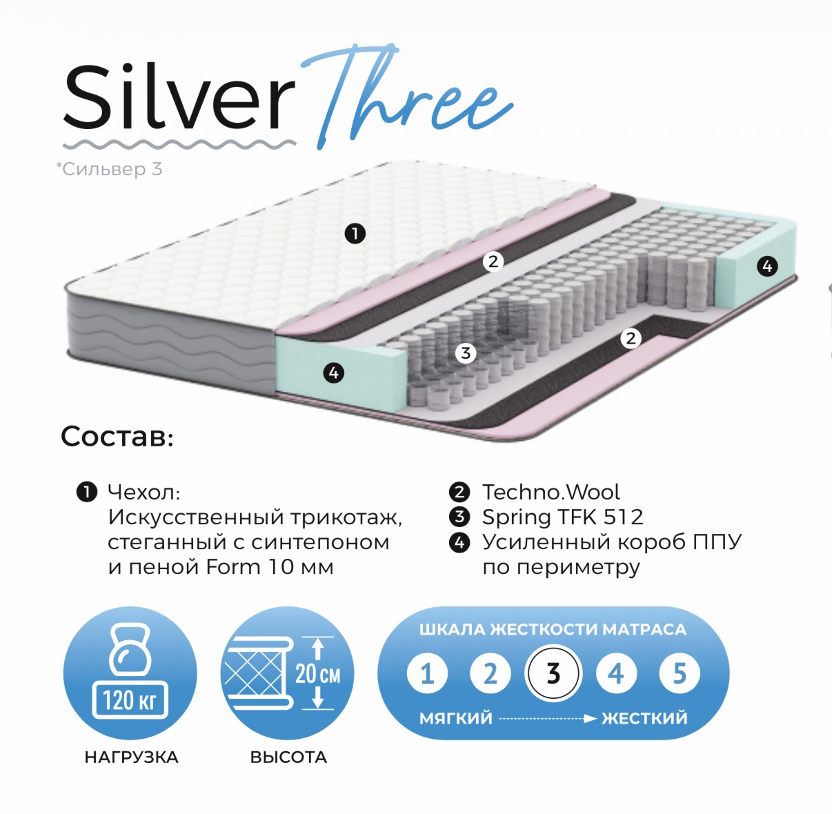 Матрас "Silver"-3 (Сильвер) сочетает в себе высокое качество, комфорт и привлекательную цену.