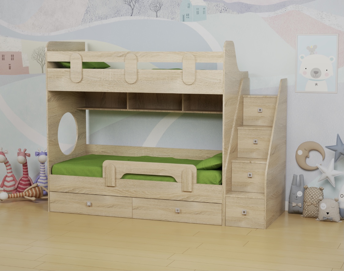 Два выдвижных ящика нижней кровати с прочным дном из ЛДСП 16 мм (не ДВП, не ХДФ!) выдерживают нагрузку до 45 кг.