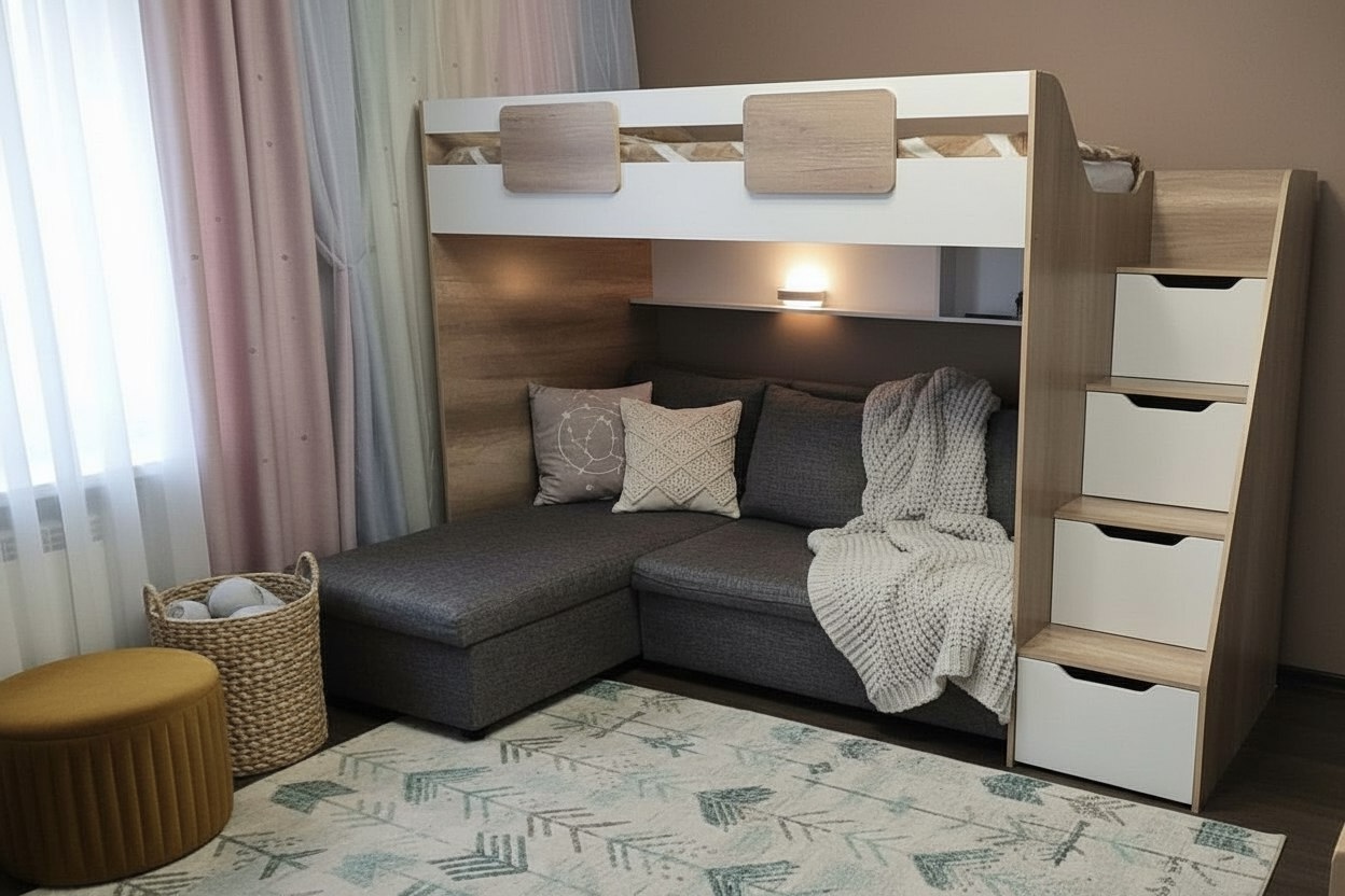 Вместо них - цельный и прочный настил из ЛДСП, который выдерживает сверхвысокую нагрузку и позволяет расположиться даже взрослому с ребенком.