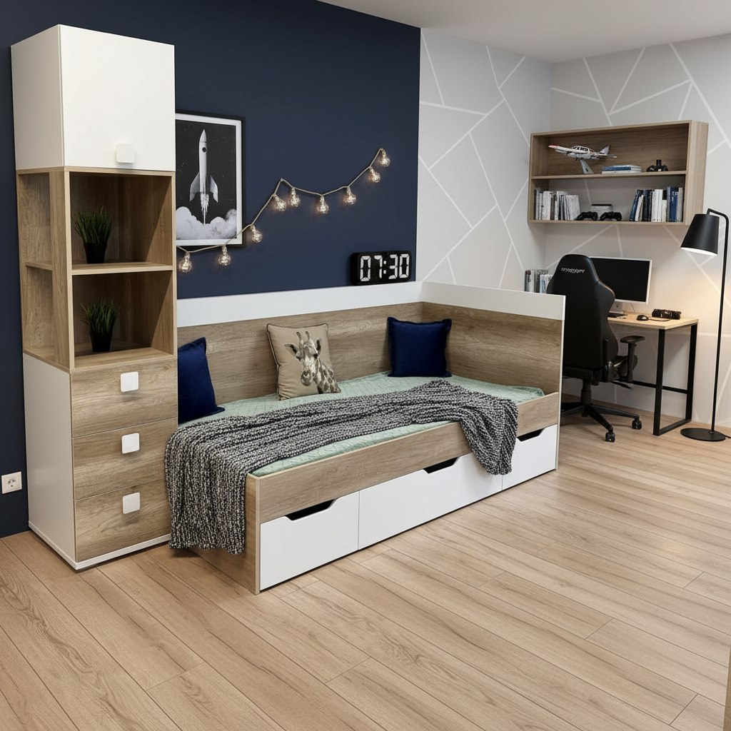 Мебель изготовлена из сертифицированного, качественного, экологически чистого ЛДСП класса Е0,5 в сочетании цветов дуб каньон с белым.