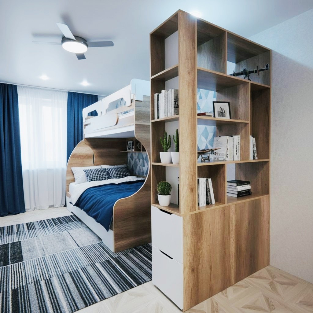 С помощью стеллажа можно разделить комнату на отдельные зоны: отдыха, учебы, встречи с друзьями, можно зонировать комнату для двоих детей.