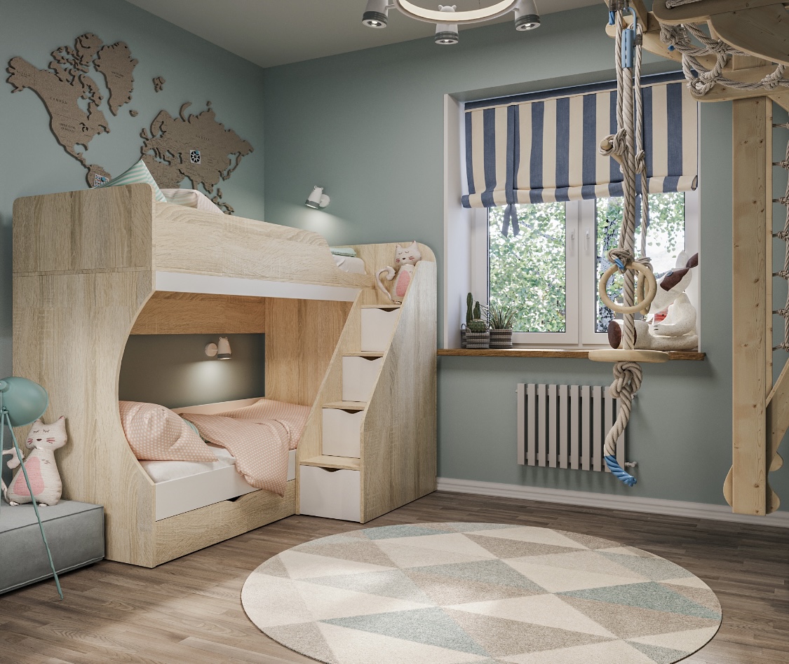 В нижнюю кровать встроен выдвижной ящик для белья и игрушек.
