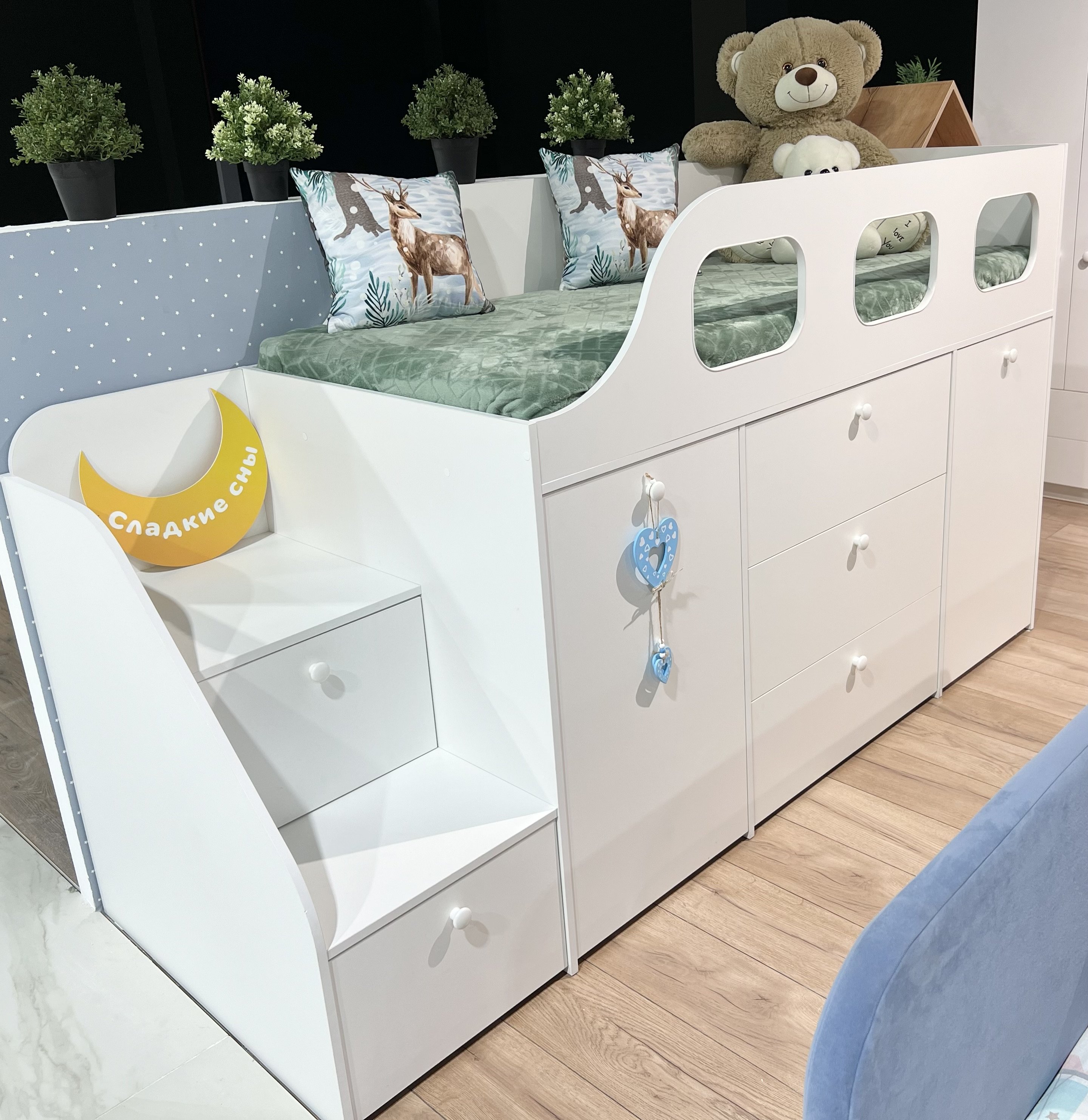 * Основание кровати – прочный настил ЛДСП (НЕ РЕЙКИ!), который позволяет ребенку спать на ровной поверхности, что важно для детской спины.