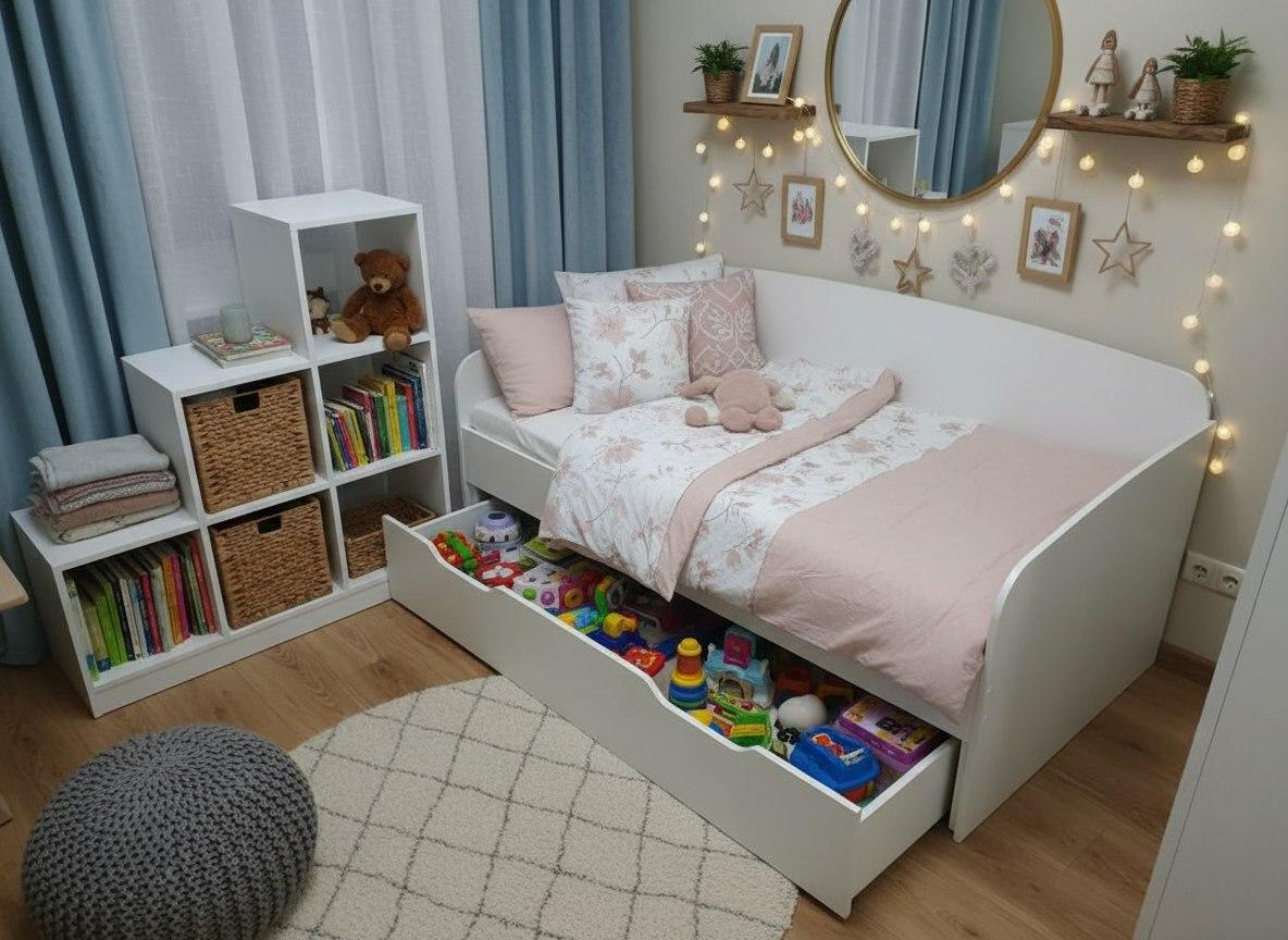 Нижняя кровать на выкатных роликах (при желании кровать можно выдвинуть полностью и поставить в другое место).