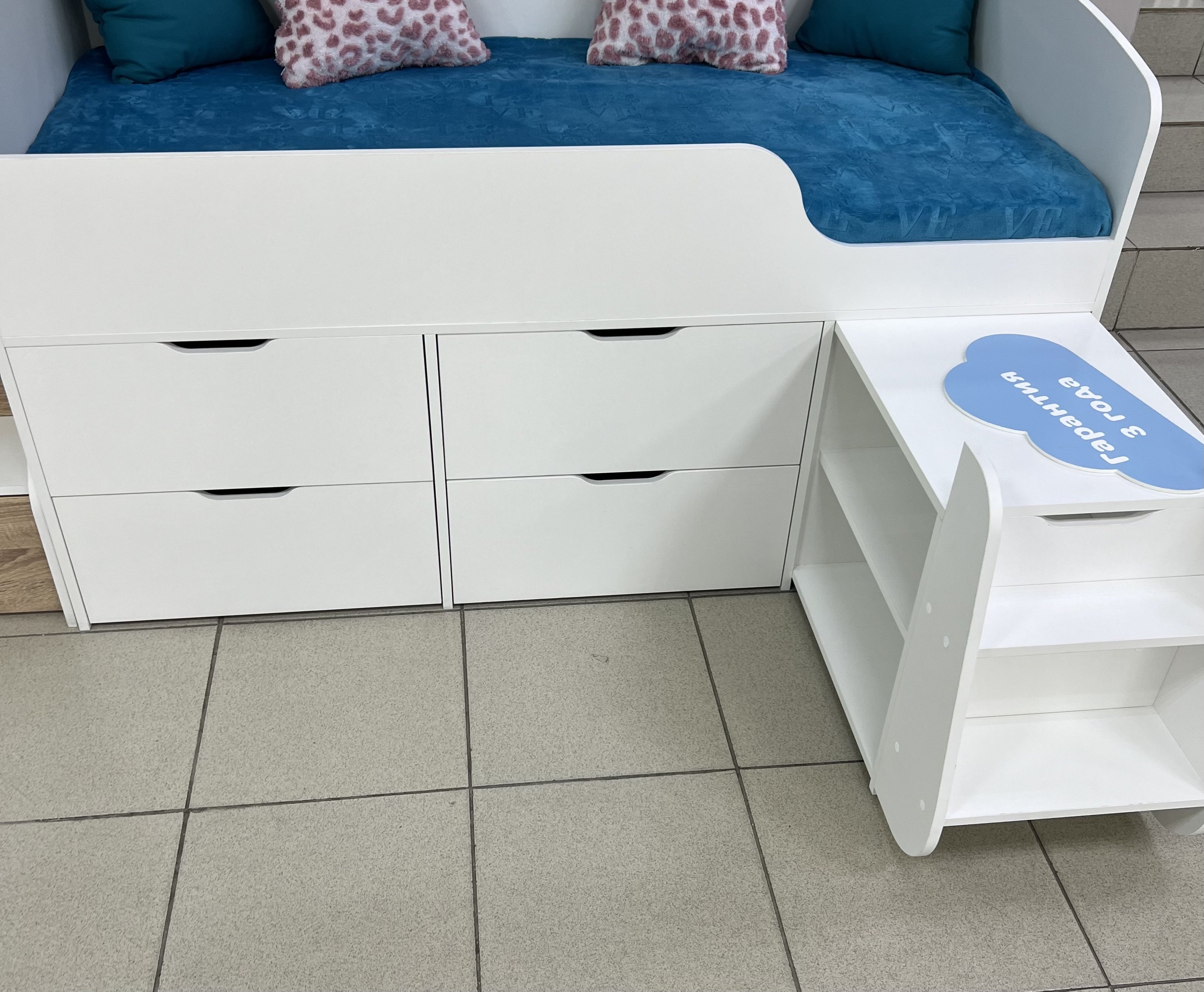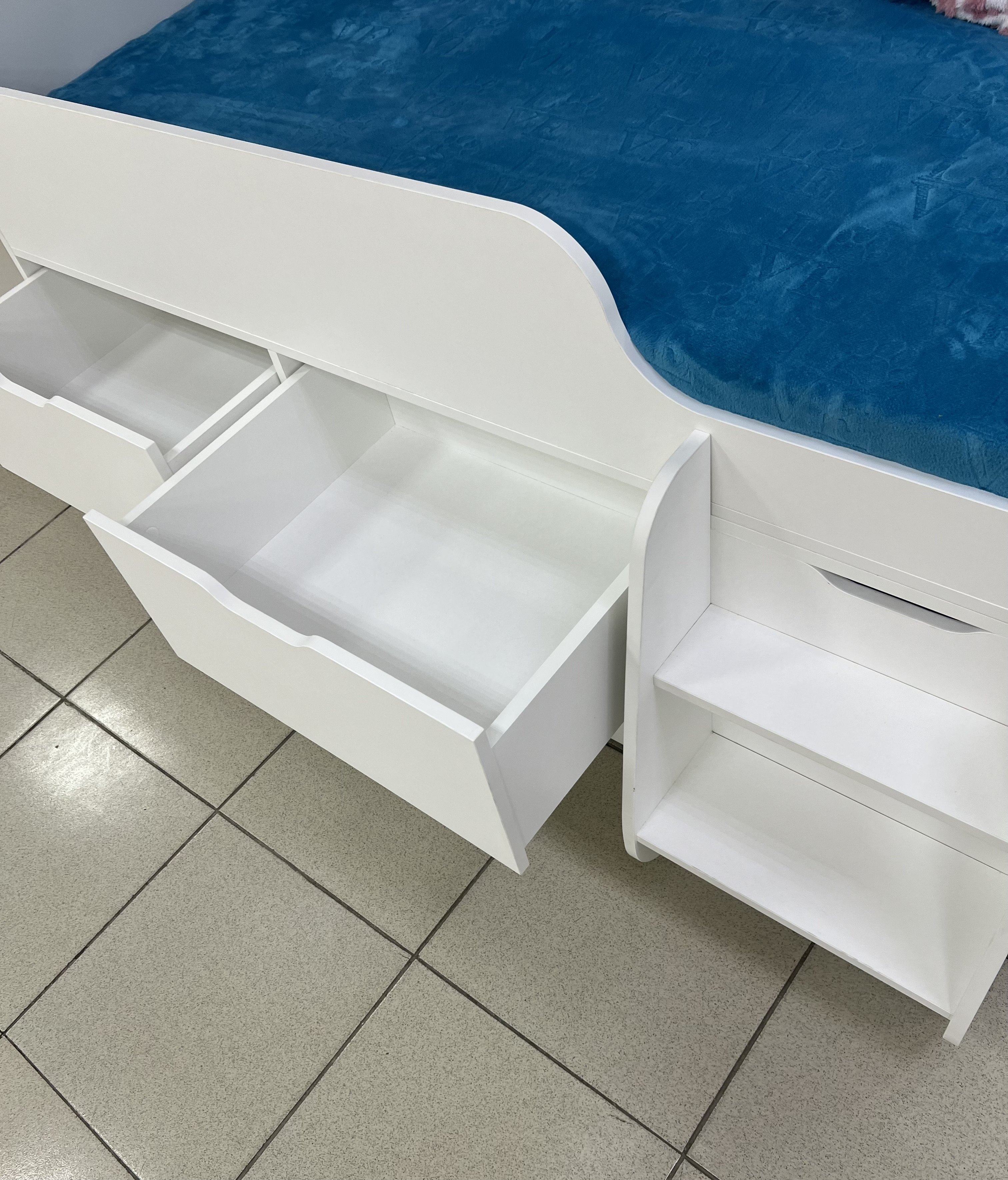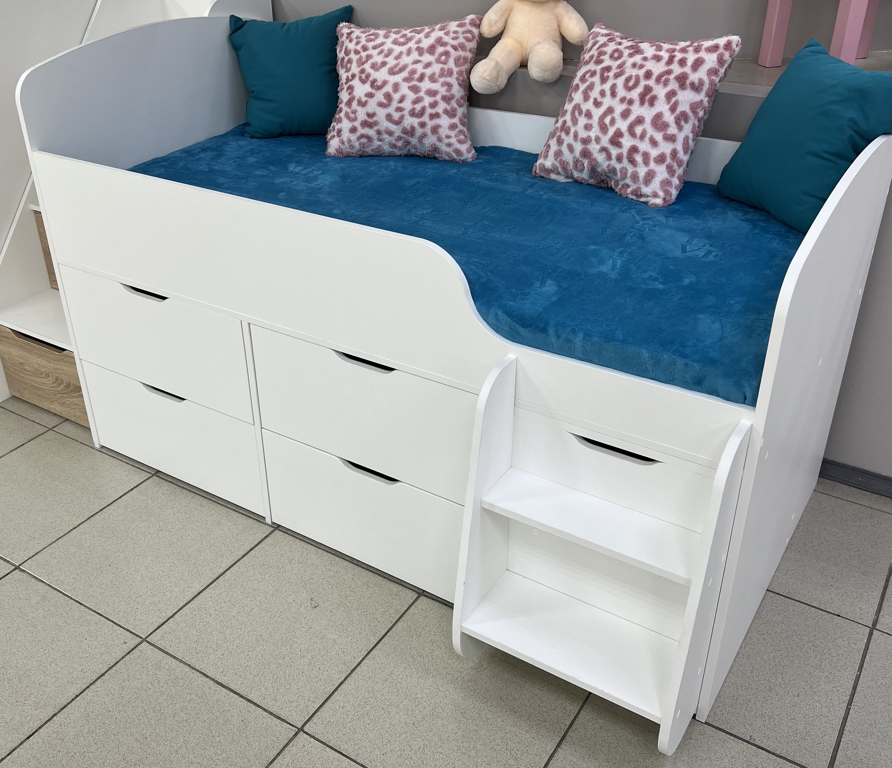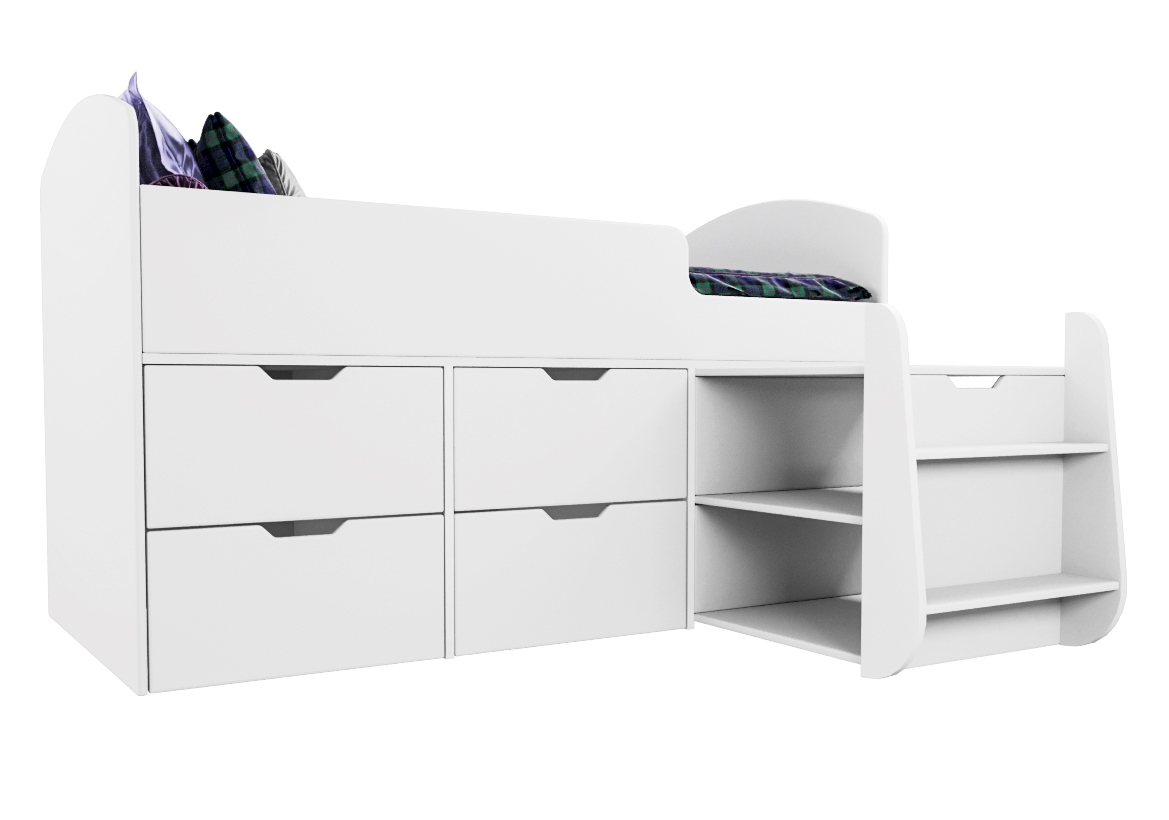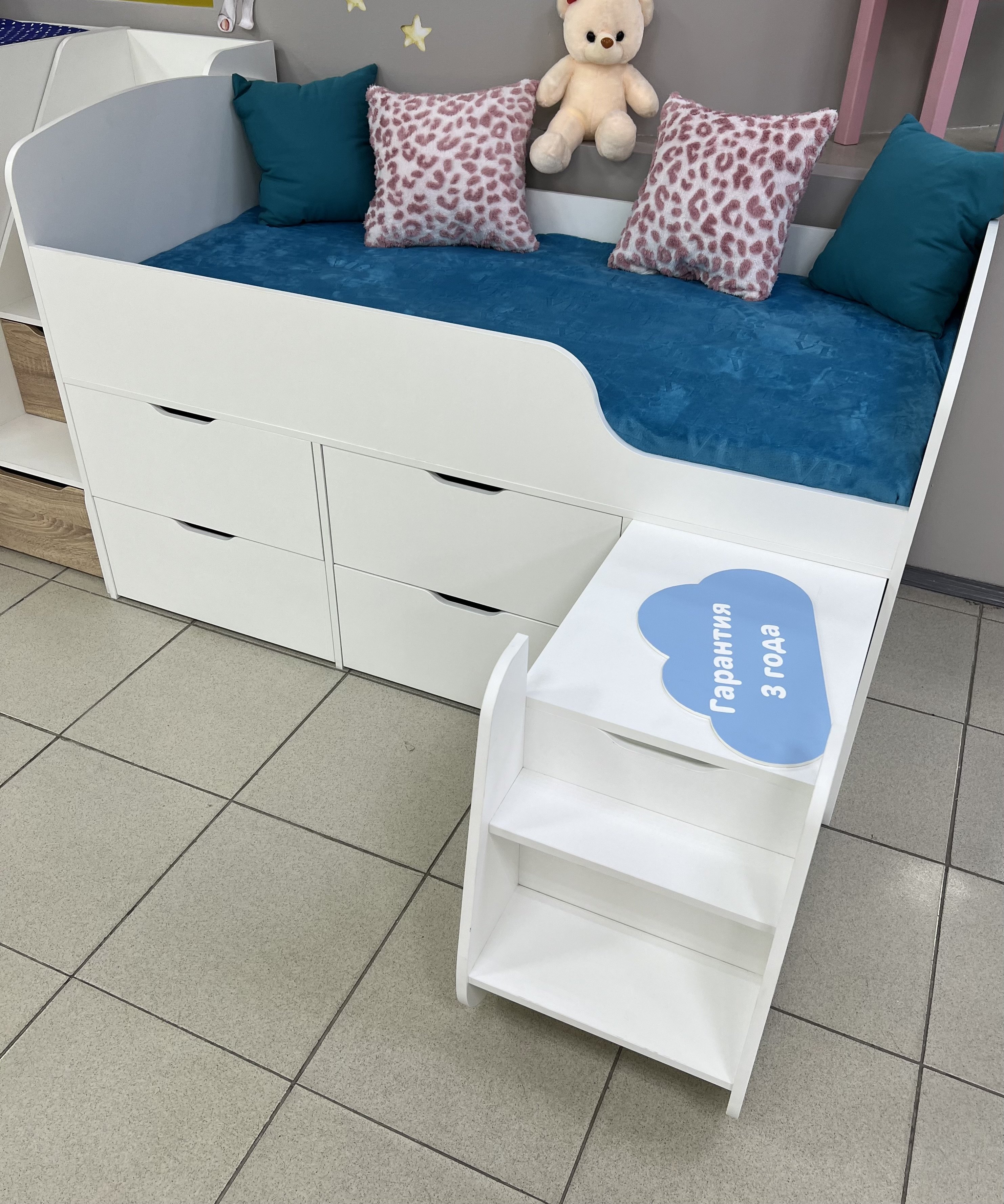 Безопасные бортики, удобная выдвижная лестница с внутренними полочками и небольшая высота кровати сделаны специально для детей младшего возраста.
