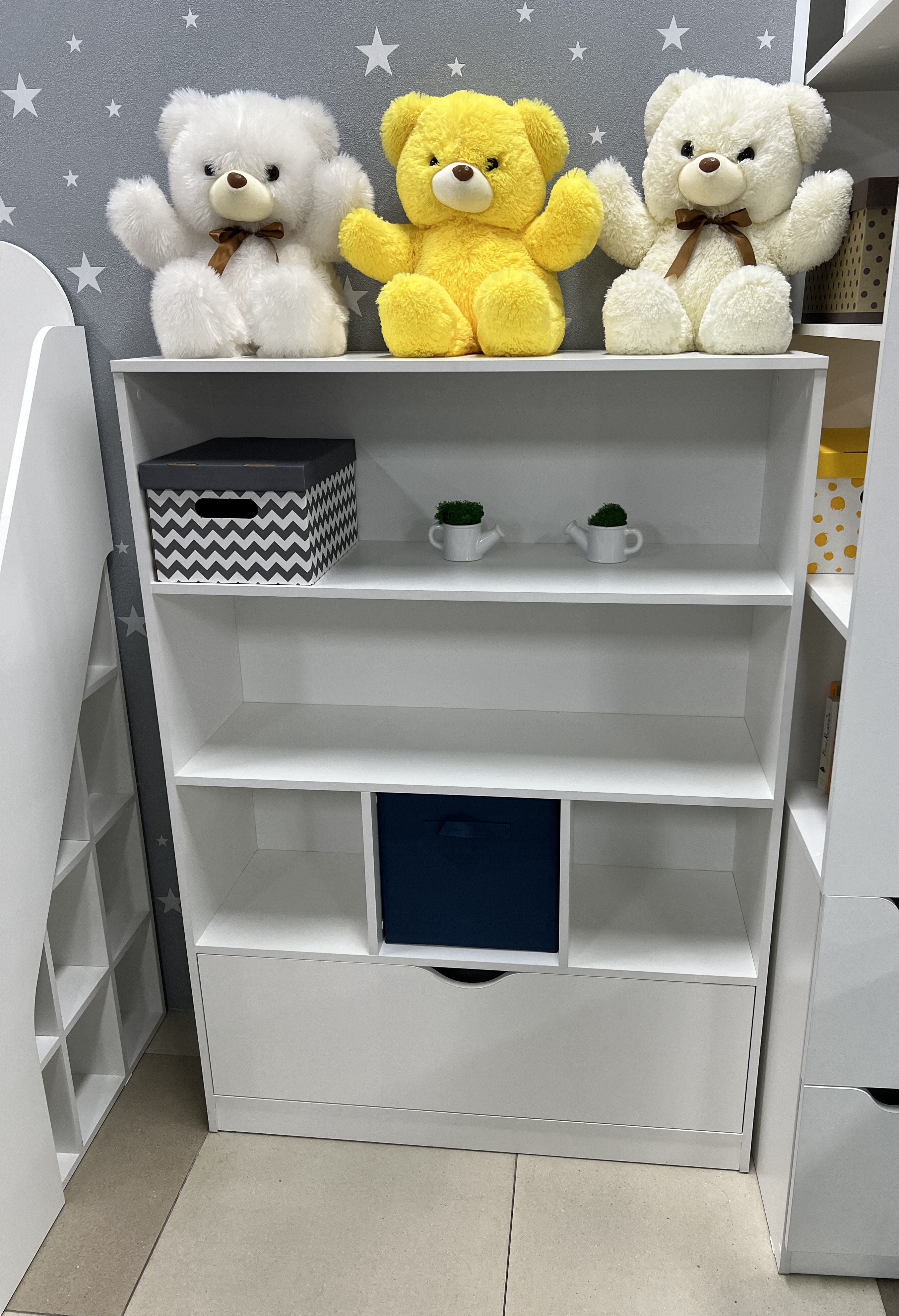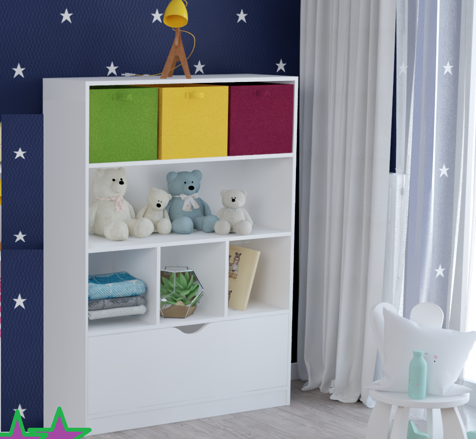 Коробки для игрушек не входят в стоимость стеллажа.