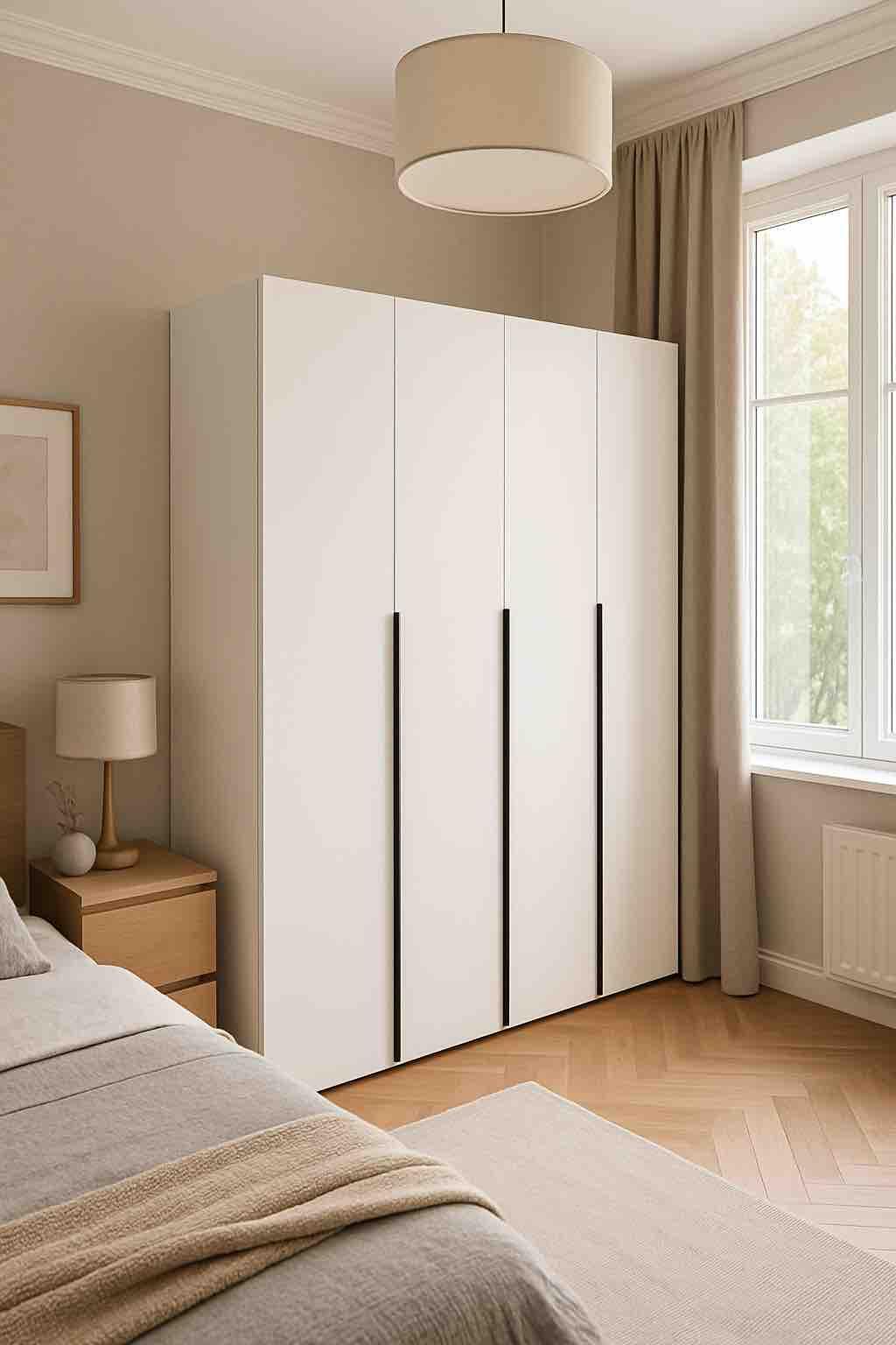 Шкаф имеет четыре распашные двери, которые оснащены доводчиками для плавного и бесшумного закрывания.