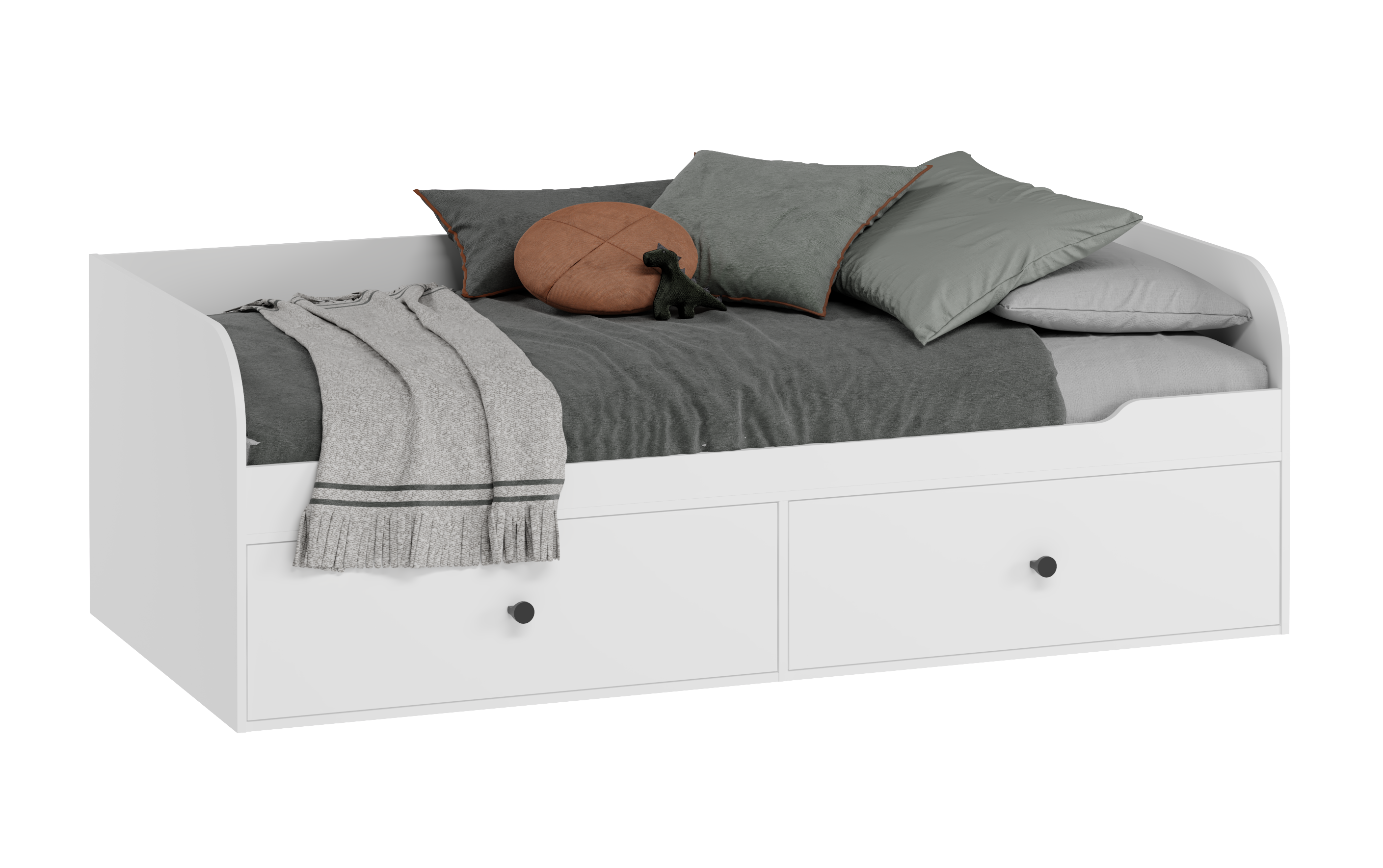 В кровать встроены два выдвижных ящика на направляющих скрытого монтажа С ДОВОДЧИКАМИ.